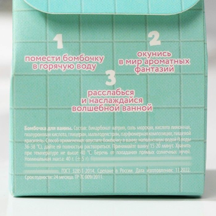 Вес бомбочки составляет 40 г, что делает её компактной и удобной для хранения. Упаковка выполнена из экологически чистых материалов, что подчеркивает заботу о природе. Бомбочка имеет яркий розовый цвет и приятную текстуру, что делает её не только полезной, но и эстетически привлекательной.