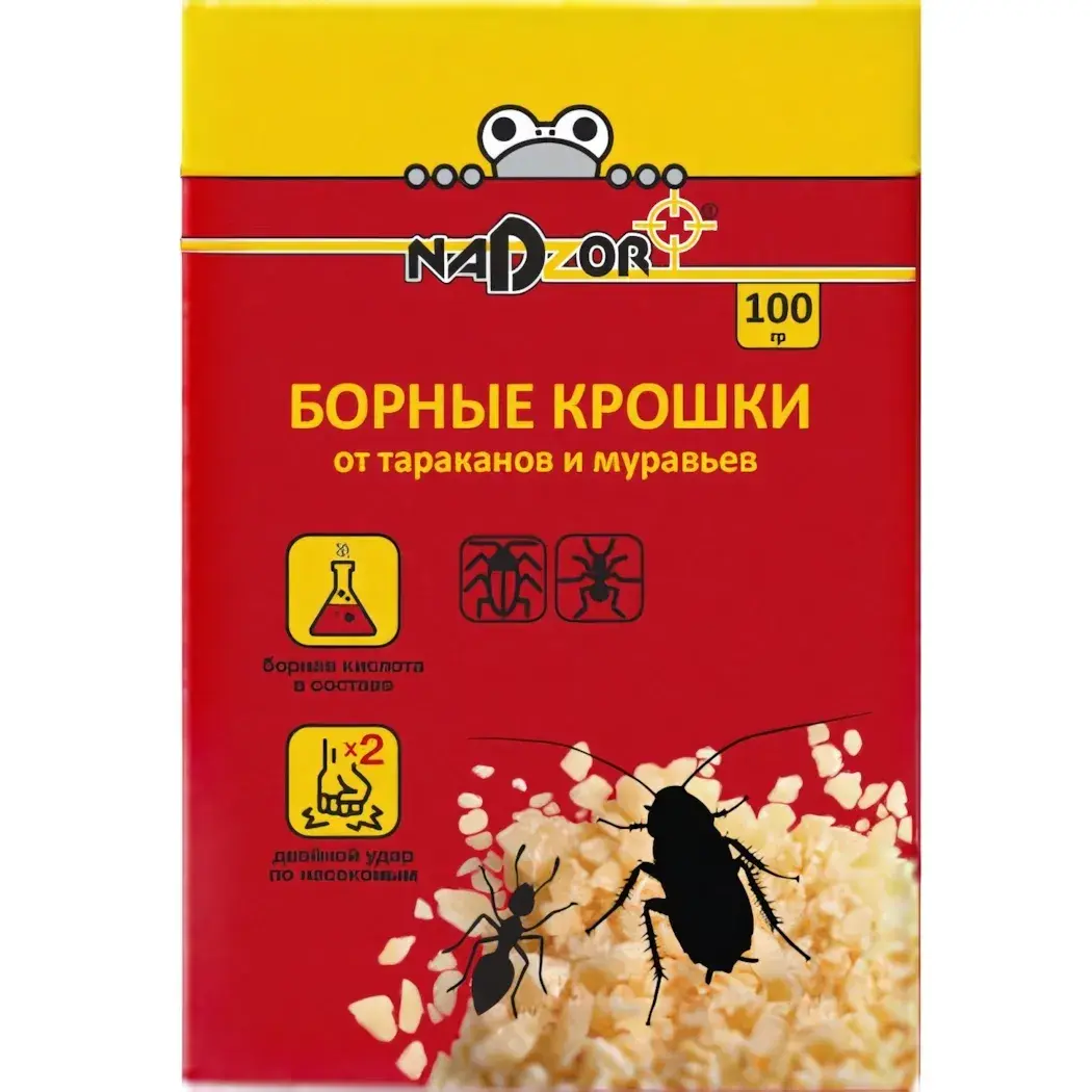 Упаковка содержит 100 граммов борных крошек, что достаточно для обработки нескольких мест. Яркая упаковка с логотипом Nadzor привлекает внимание и информирует о составе. Не упустите возможность сделать ваш дом свободным от насекомых с помощью этого эффективного средства!