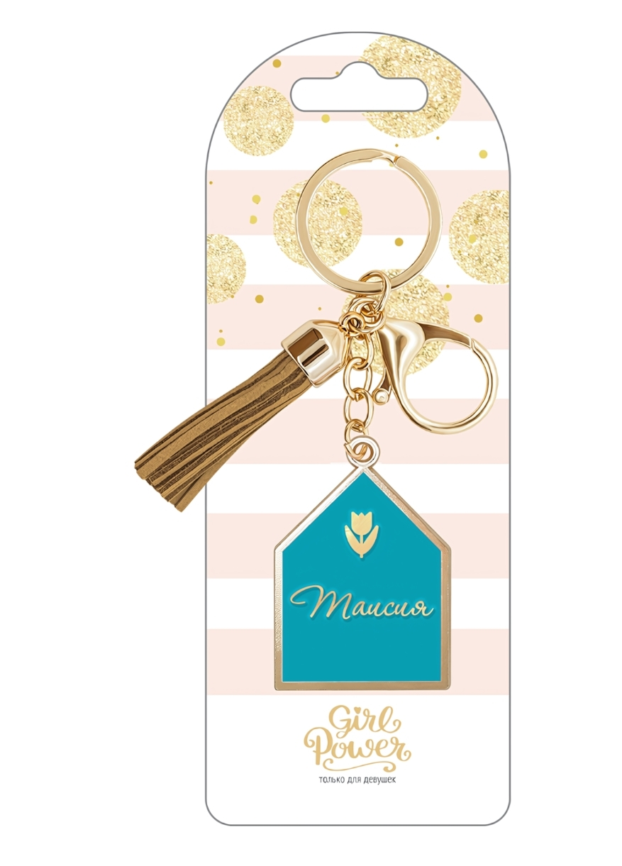 Брелок "Power Girl" с кисточкой экокожи, металлический, бирюзово-золотой, форма домика