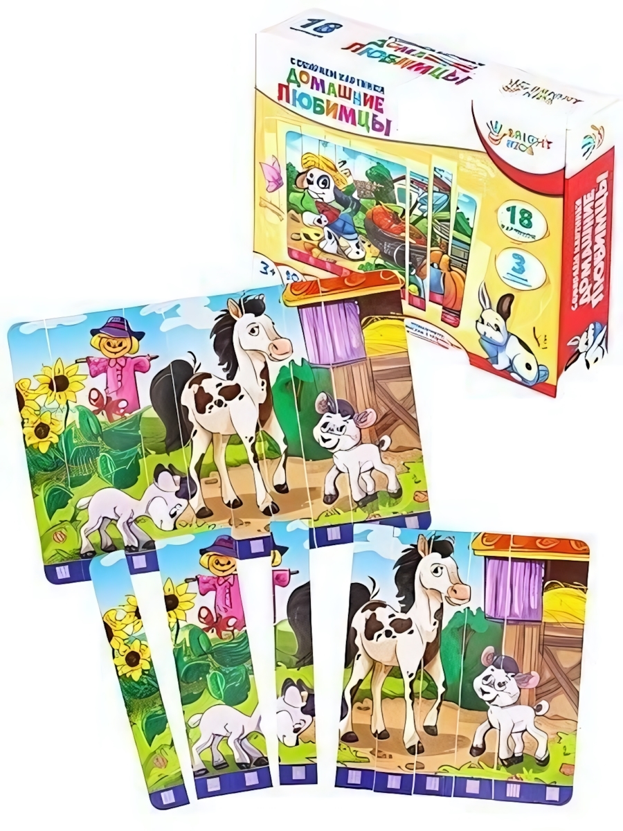 В наборе 18 карточек с изображениями различных домашних животных, таких как собака, кошка, лошадь и другие. Каждая карточка оформлена в ярких цветах, что делает их привлекательными для детей. Упаковка имеет прямоугольную форму и выполнена в ярких цветах, что также привлекает внимание. Эти карточки станут отличным подарком для вашего малыша и помогут ему узнать больше о мире домашних животных.