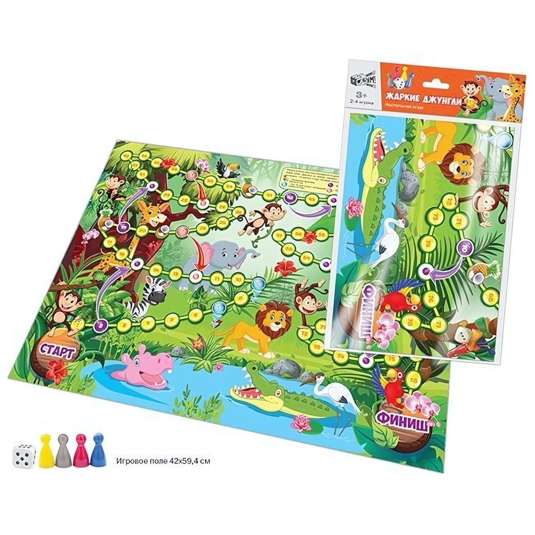 Настольная игра-ходилка «Жаркие джунгли» А2, 594х420 мм, картон и пластик, для 2-4 игроков от 3 лет