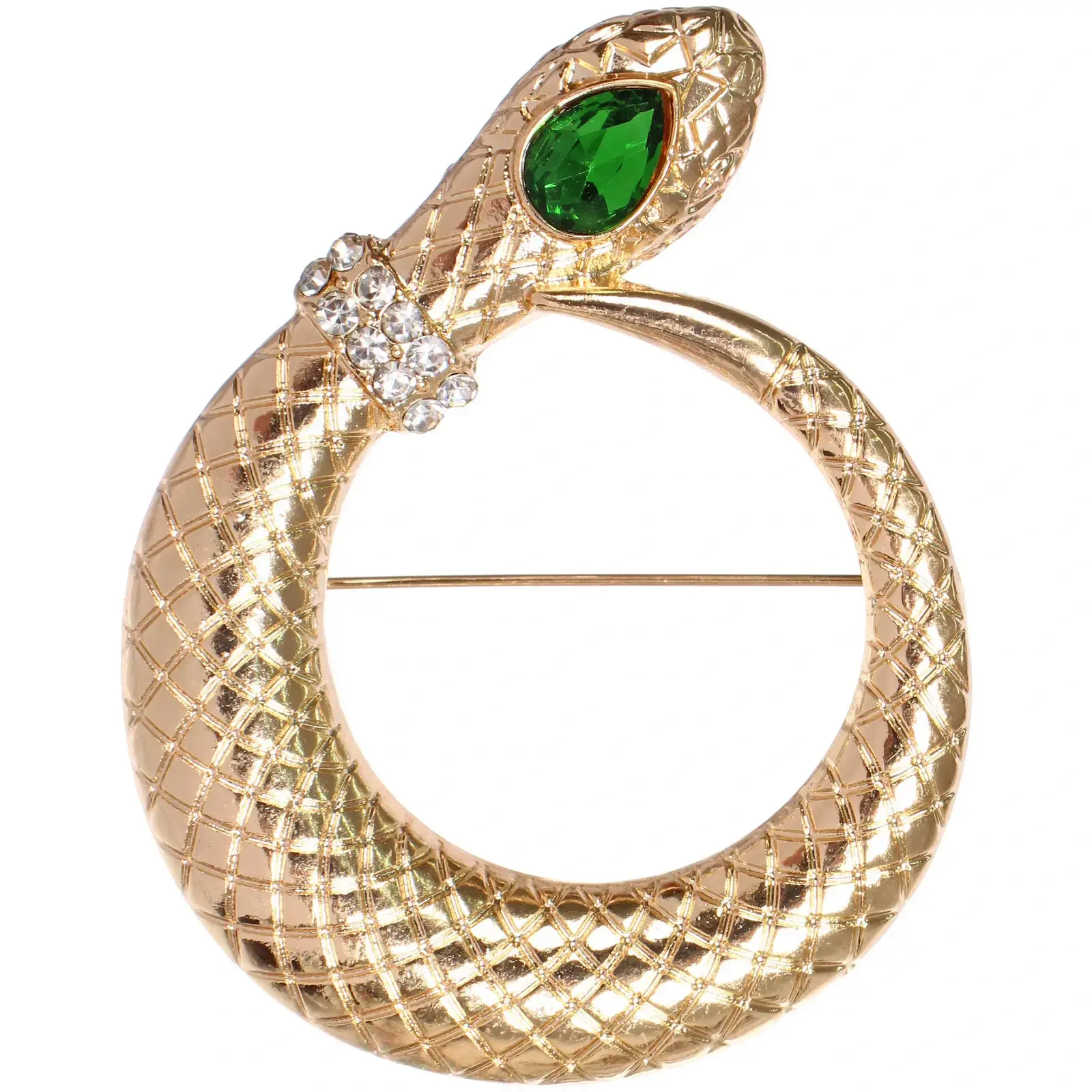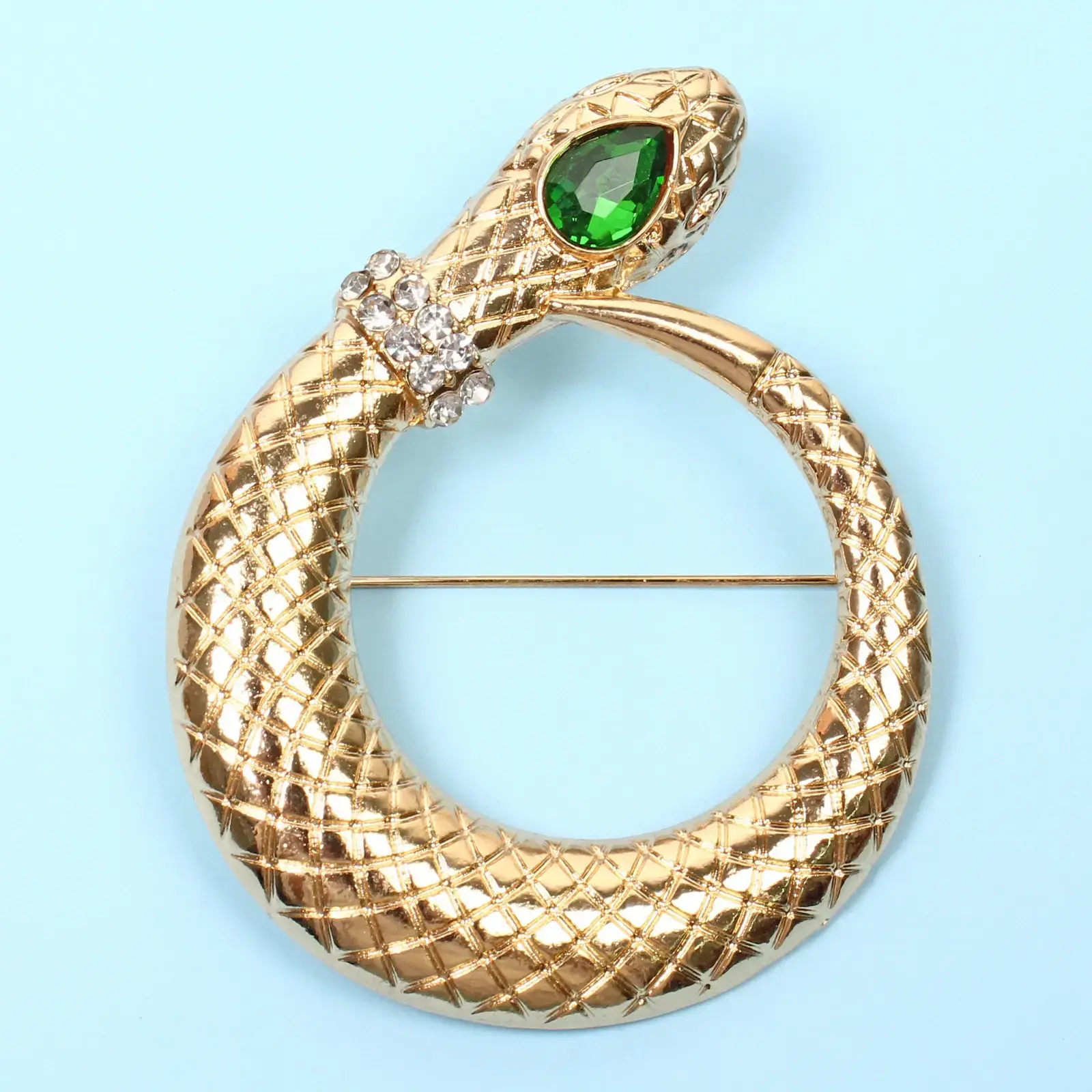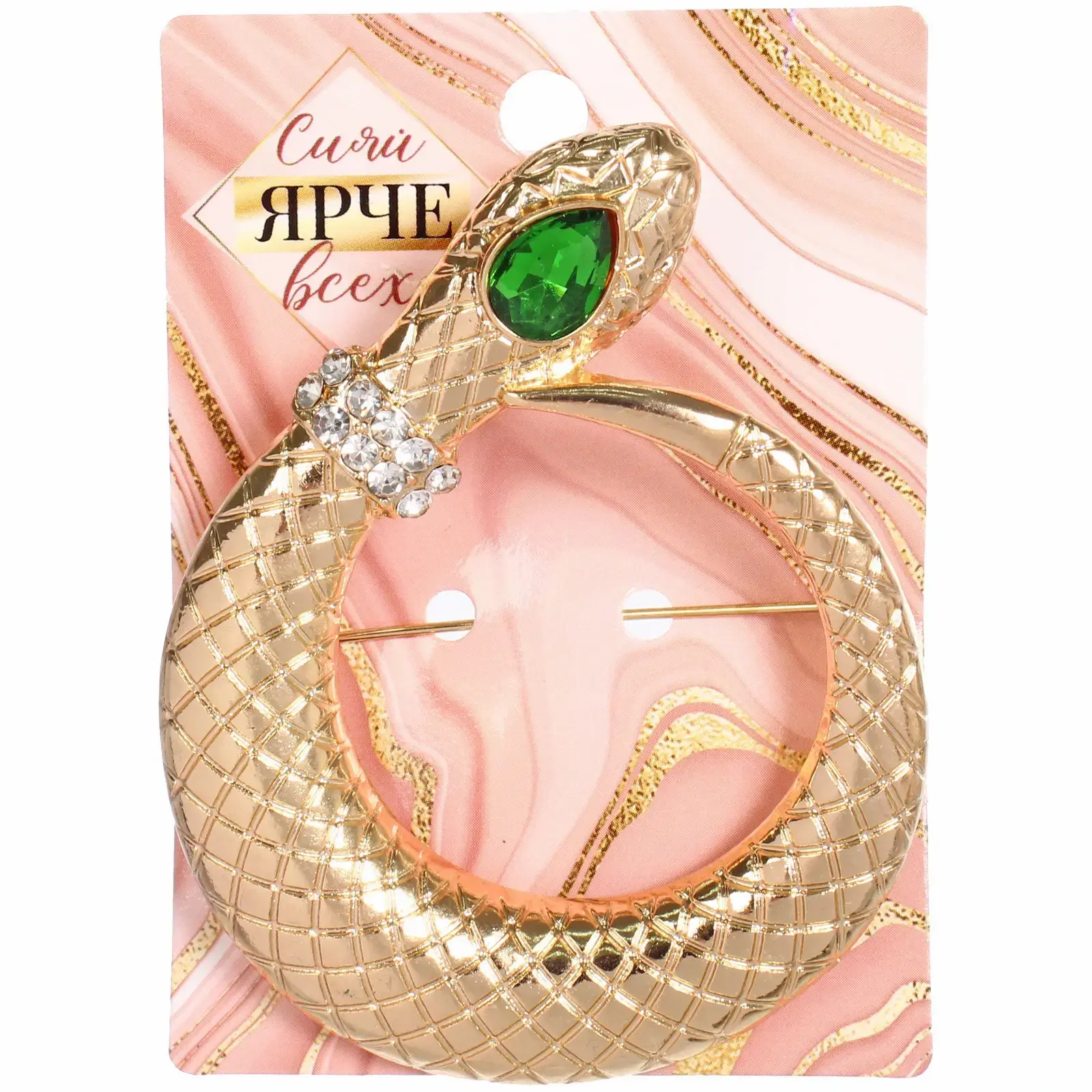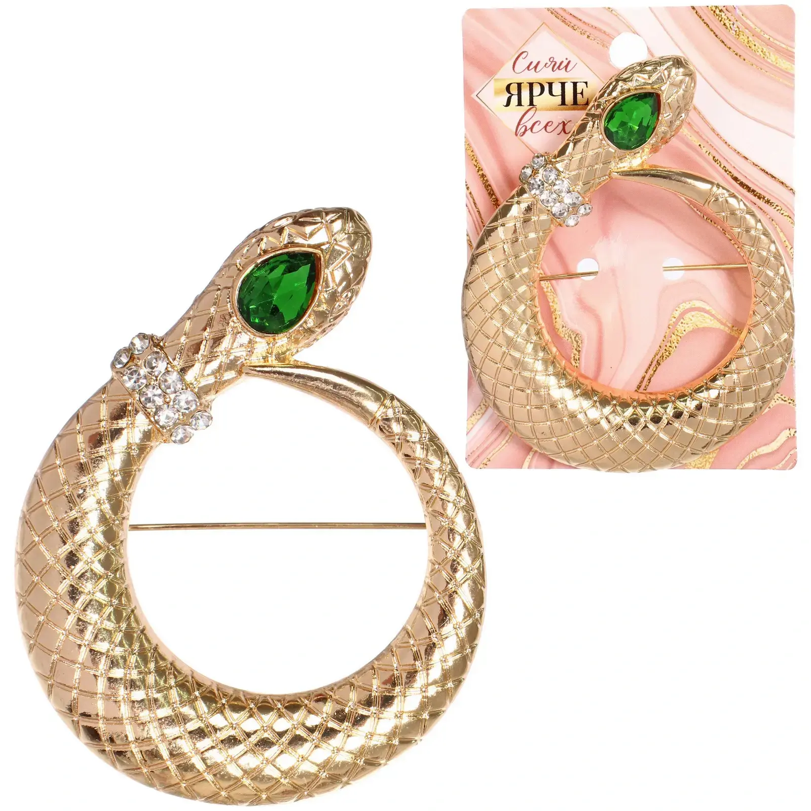 Брошь «Офиона» в форме змеи, золотистый металл, зеленый камень и стразы, 5х6,5 см