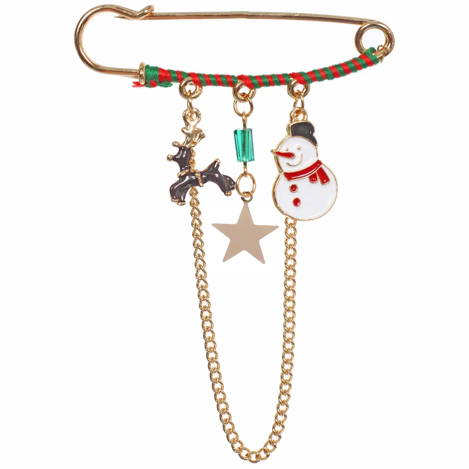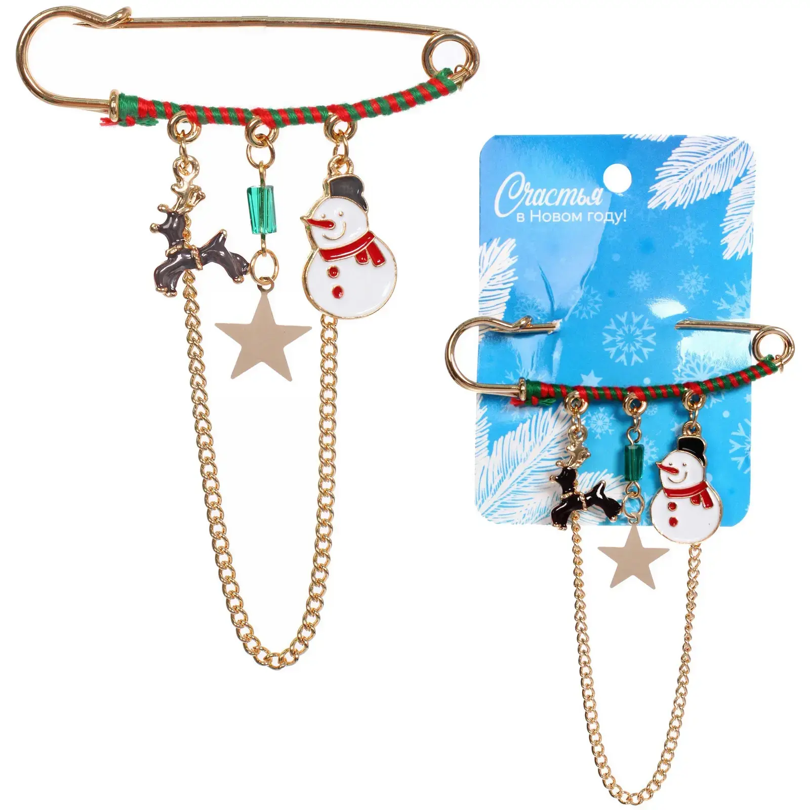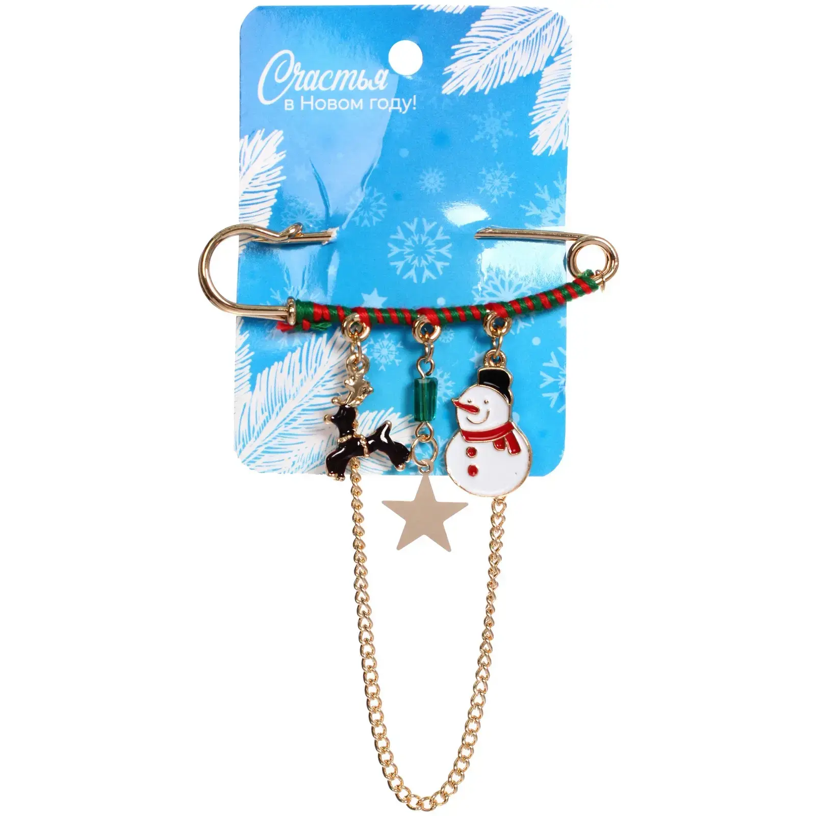 Брошь выполнена из качественного металла, что обеспечивает её долговечность и надежность. Декоративные элементы, такие как фигурки оленя и снеговика, выполнены с вниманием к деталям и добавляют праздничного настроения. Золотистая основа и яркие цвета делают её универсальной для сочетания с различными стилями одежды.