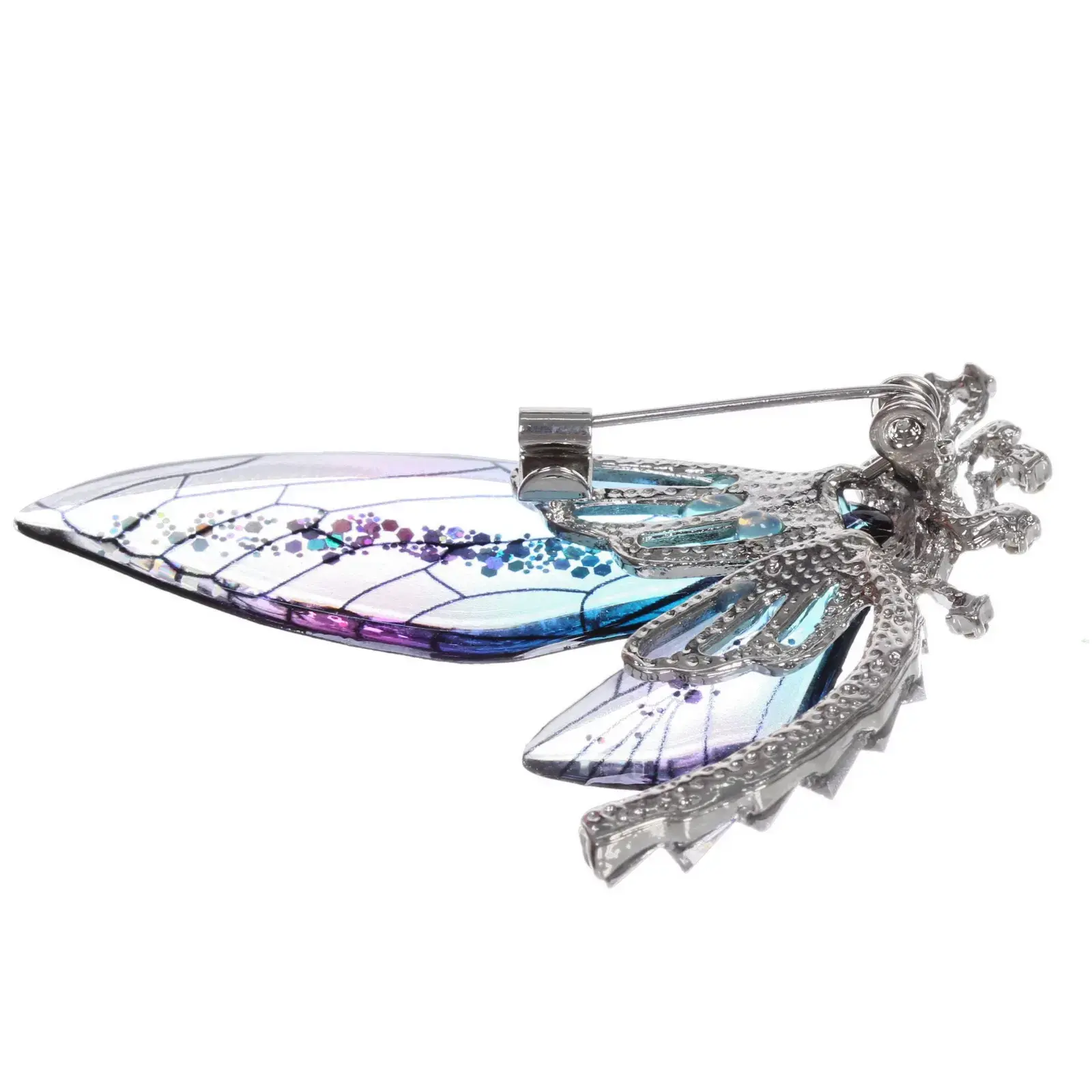 Размер броши составляет 6х4,7 см, что делает её достаточно заметной, но не слишком громоздкой. Основной цвет — синий с переливами фиолетового, что добавляет изделию яркости и оригинальности. Брошь станет отличным акцентом как на верхней одежде, так и на аксессуарах.