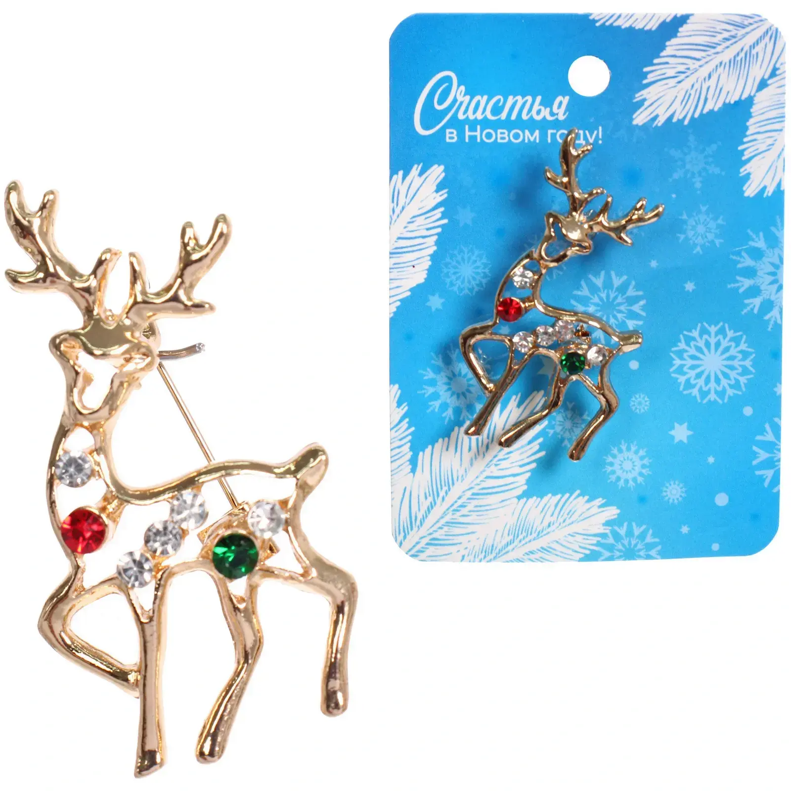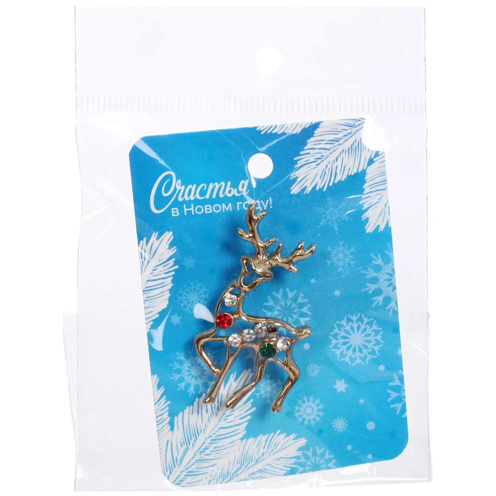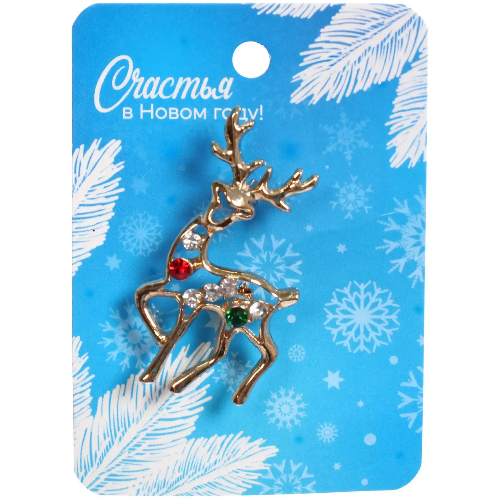 Размер броши составляет 5 см, что делает её компактной и удобной для ношения. Золотистый цвет и блестящая поверхность придают изделию праздничный вид, а разноцветные камни (красный, зеленый и прозрачный) добавляют яркости и оригинальности. Брошь упакована на картонной подложке с голубым фоном, украшенной снежинками и надписью «Счастья в Новом году!», что делает её отличным вариантом для подарка.