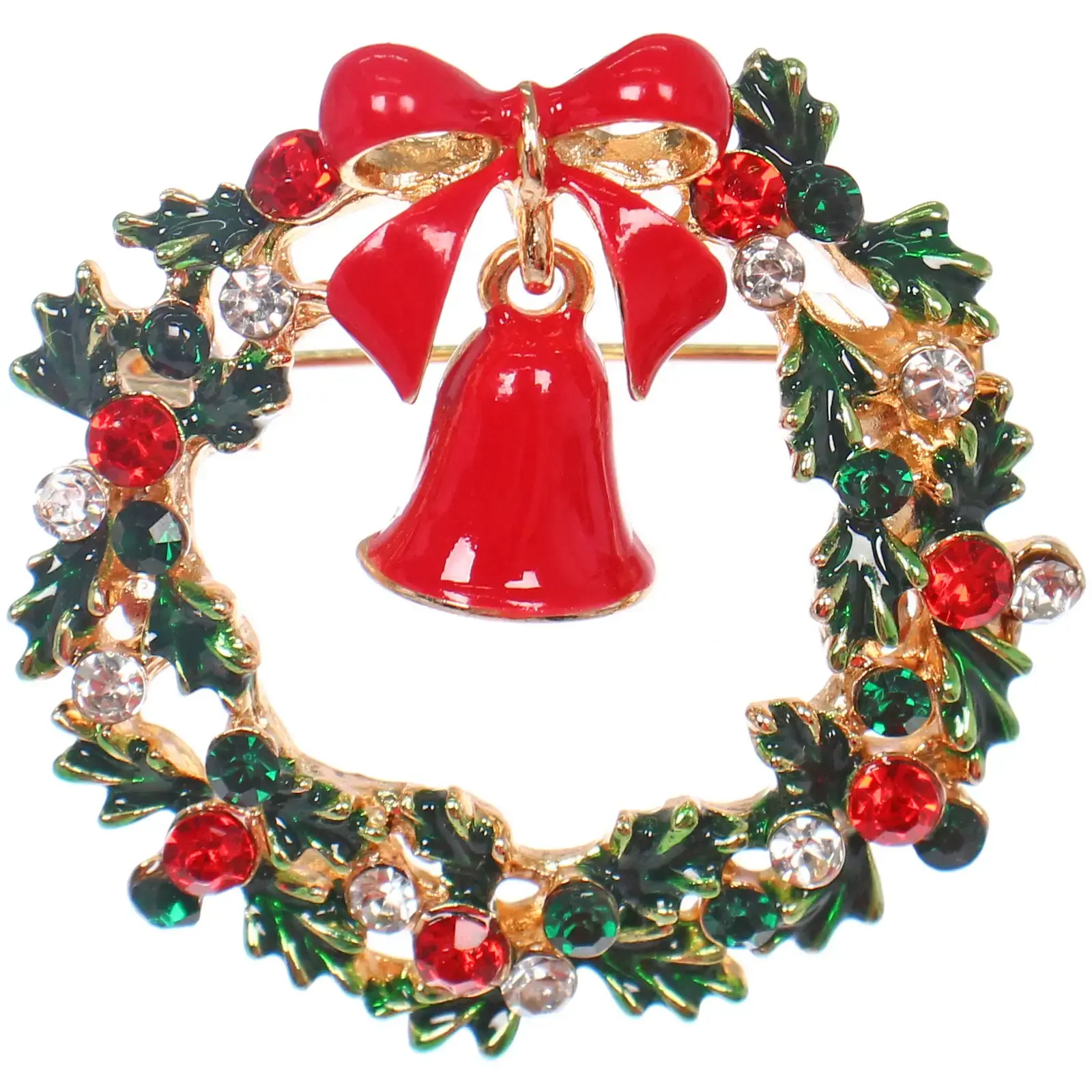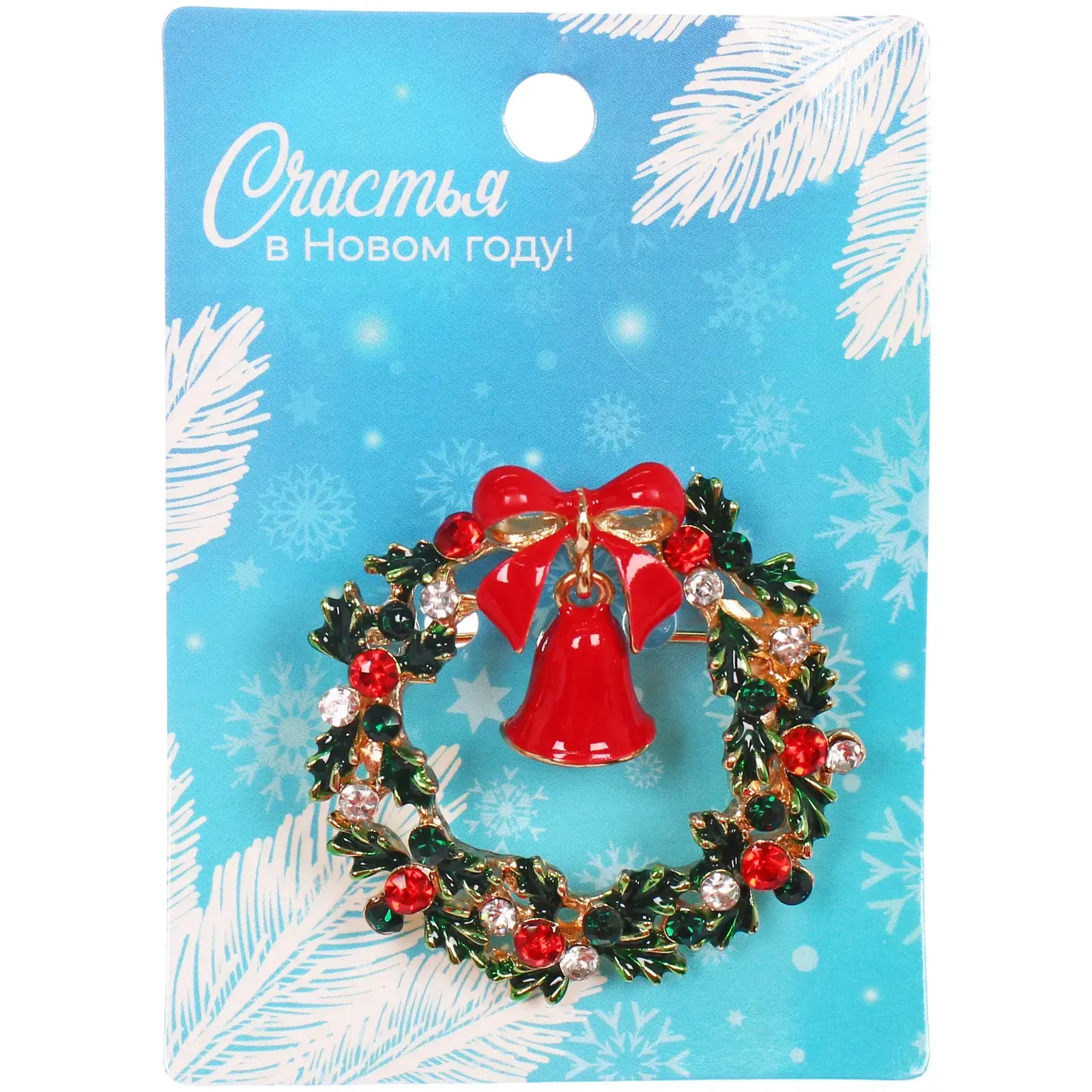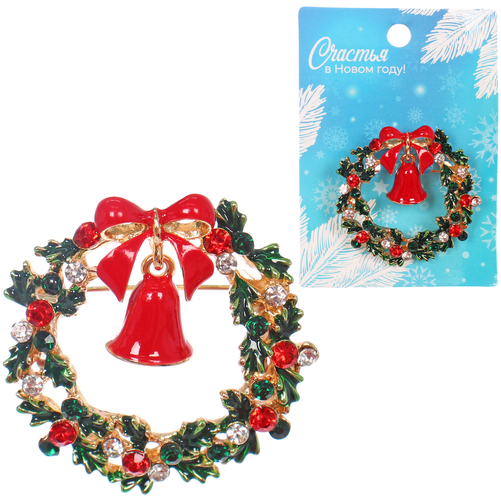 Брошь «Рождественский венок» с колокольчиком, 3 см, металл, золотистый, красный, зеленый