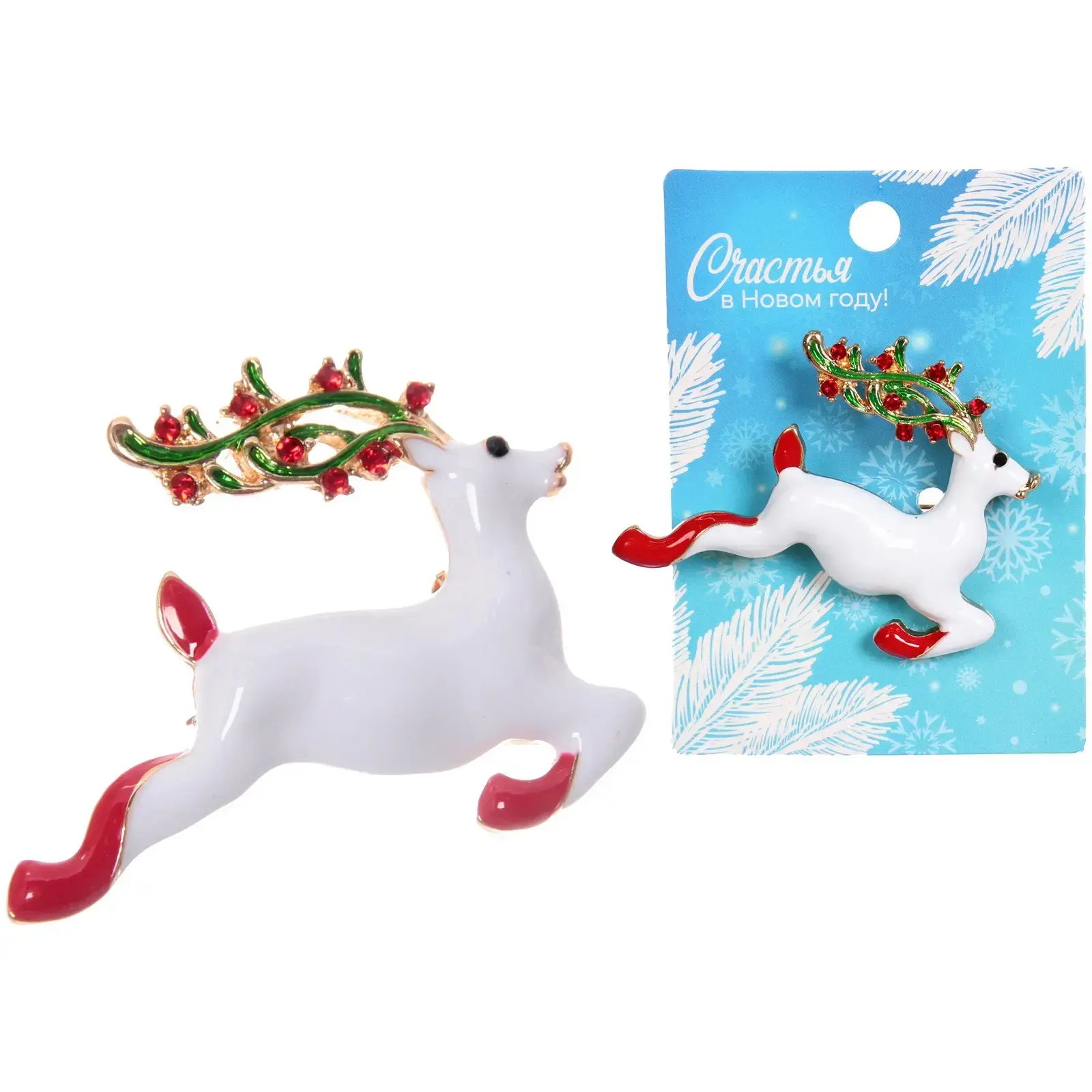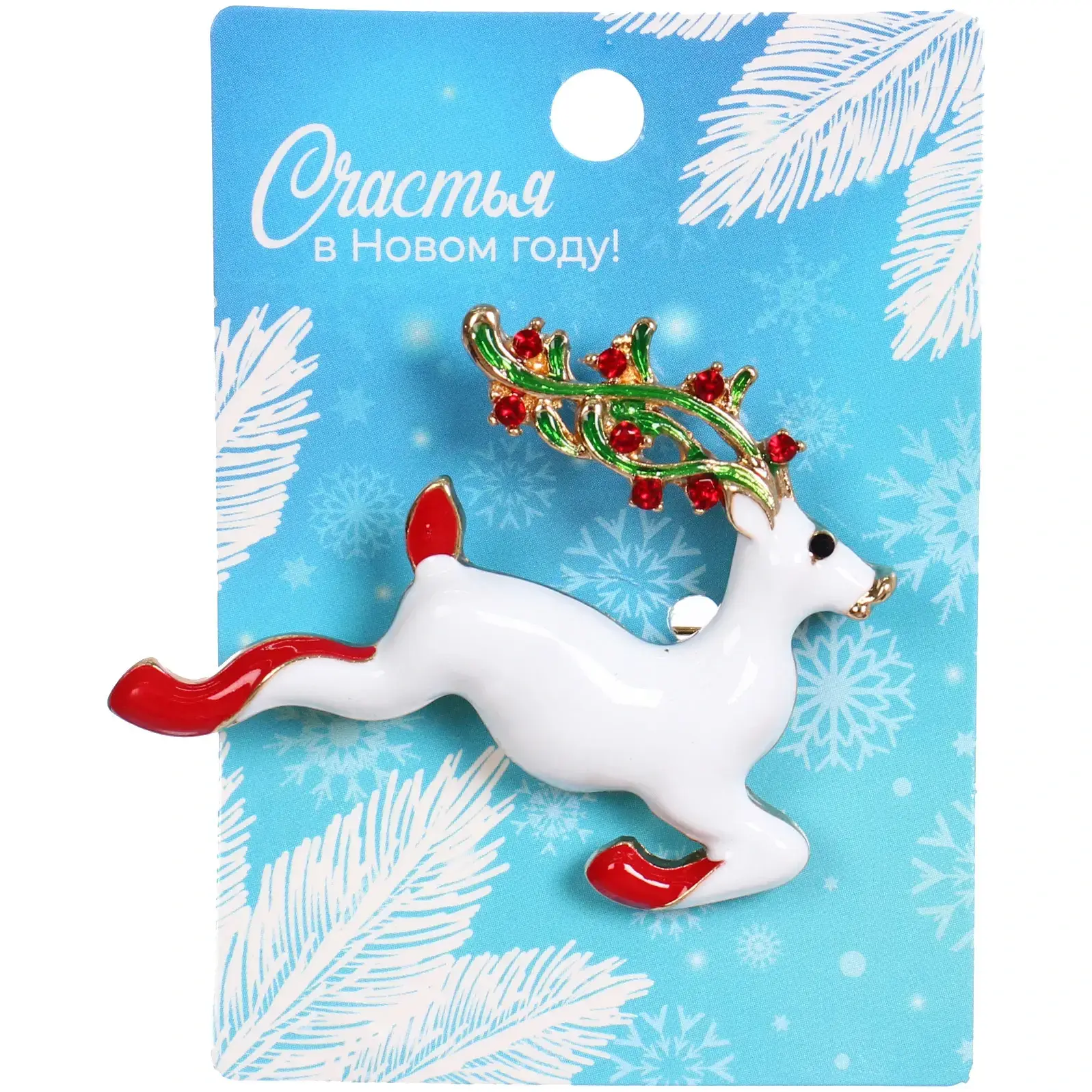 Дизайнерская проработка деталей: зелёная ветка с красными ягодами на рогах, фактурная отделка шерсти и поза оленя в прыжке. Брошь поставляется в голубой упаковке со снежинками и надписью «Счастья в Новом году!» — готовый вариант для подарка близким.