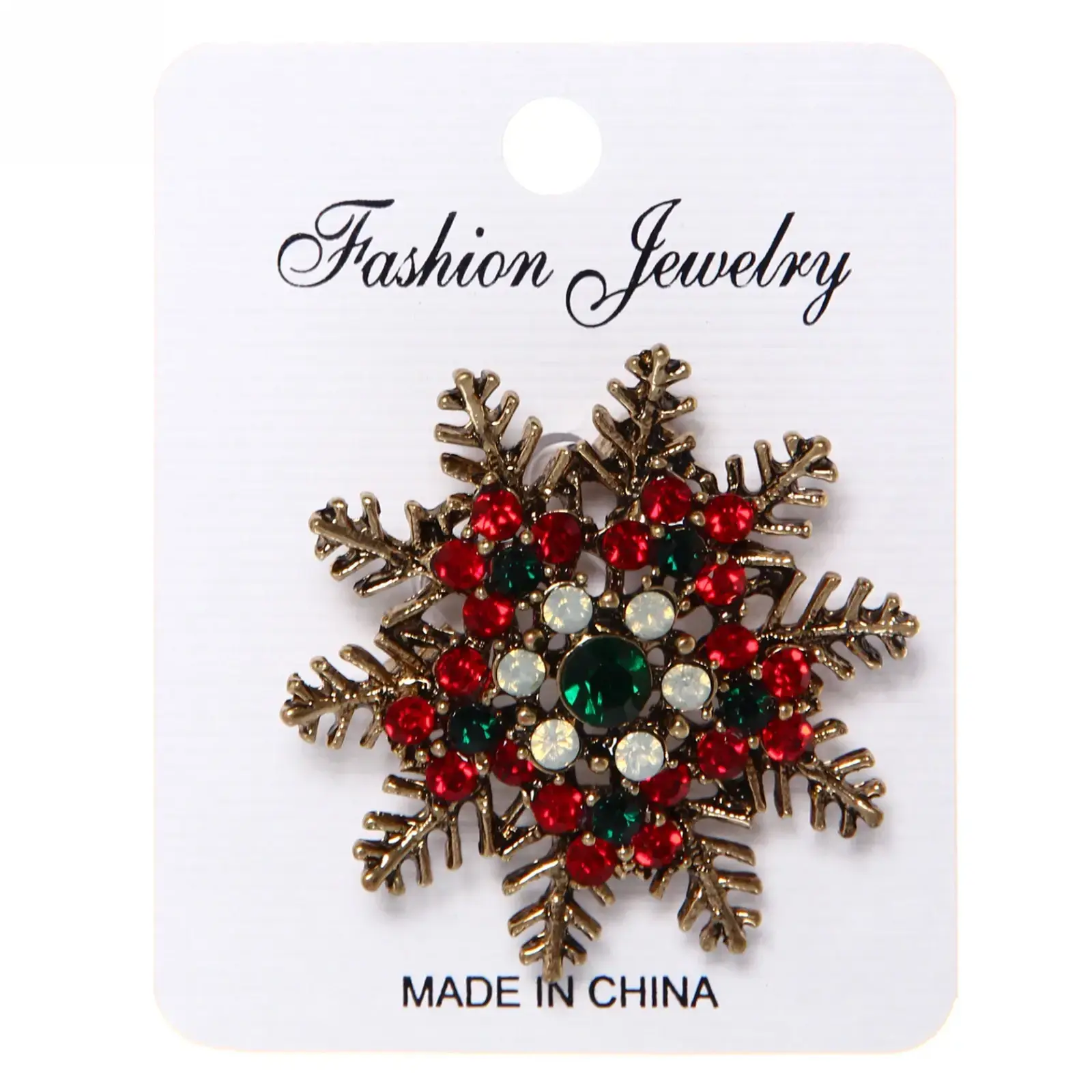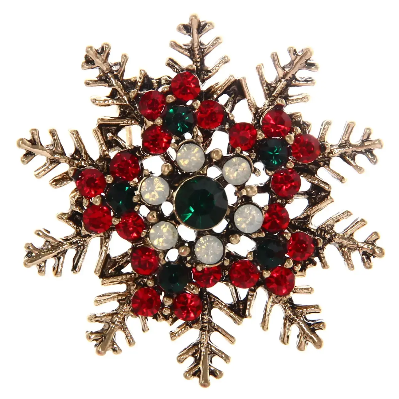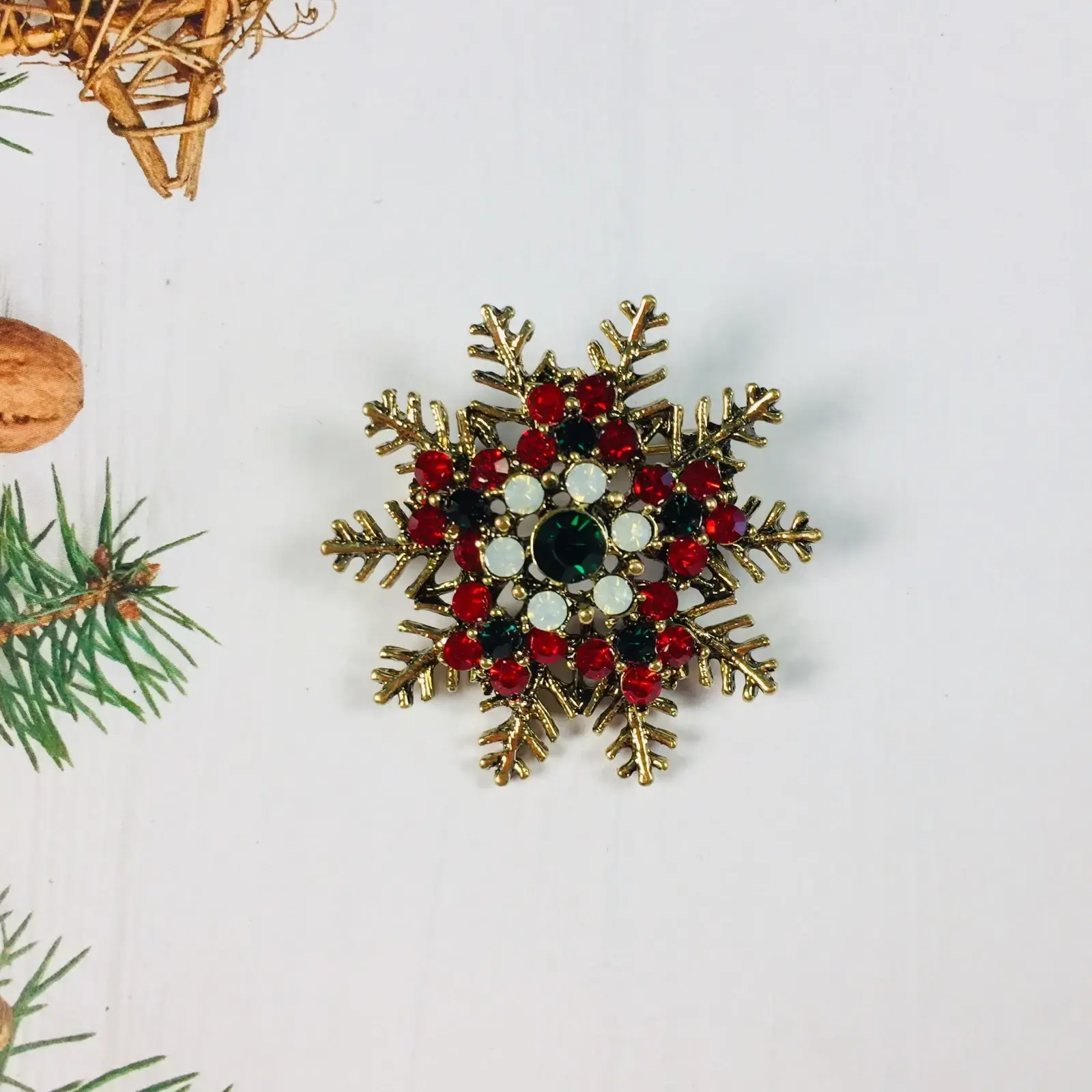 Эта изысканная брошь в форме снежинки станет идеальным украшением для вашего новогоднего образа. Она добавит нотку волшебства и стиля в любой наряд, подчеркивая вашу индивидуальность и вкус. Яркие стеклянные камни красного, зеленого и прозрачного цветов создают эффектный контраст с золотистым металлическим финишем, придавая изделию праздничный вид.
