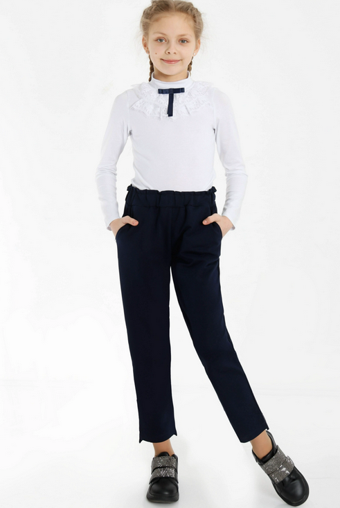 Эти тёмно-синие брюки идеально подойдут для школьных будней вашей девочки. Они сочетают в себе комфорт и элегантный внешний вид, позволяя ребёнку чувствовать себя уверенно и свободно в течение всего дня.