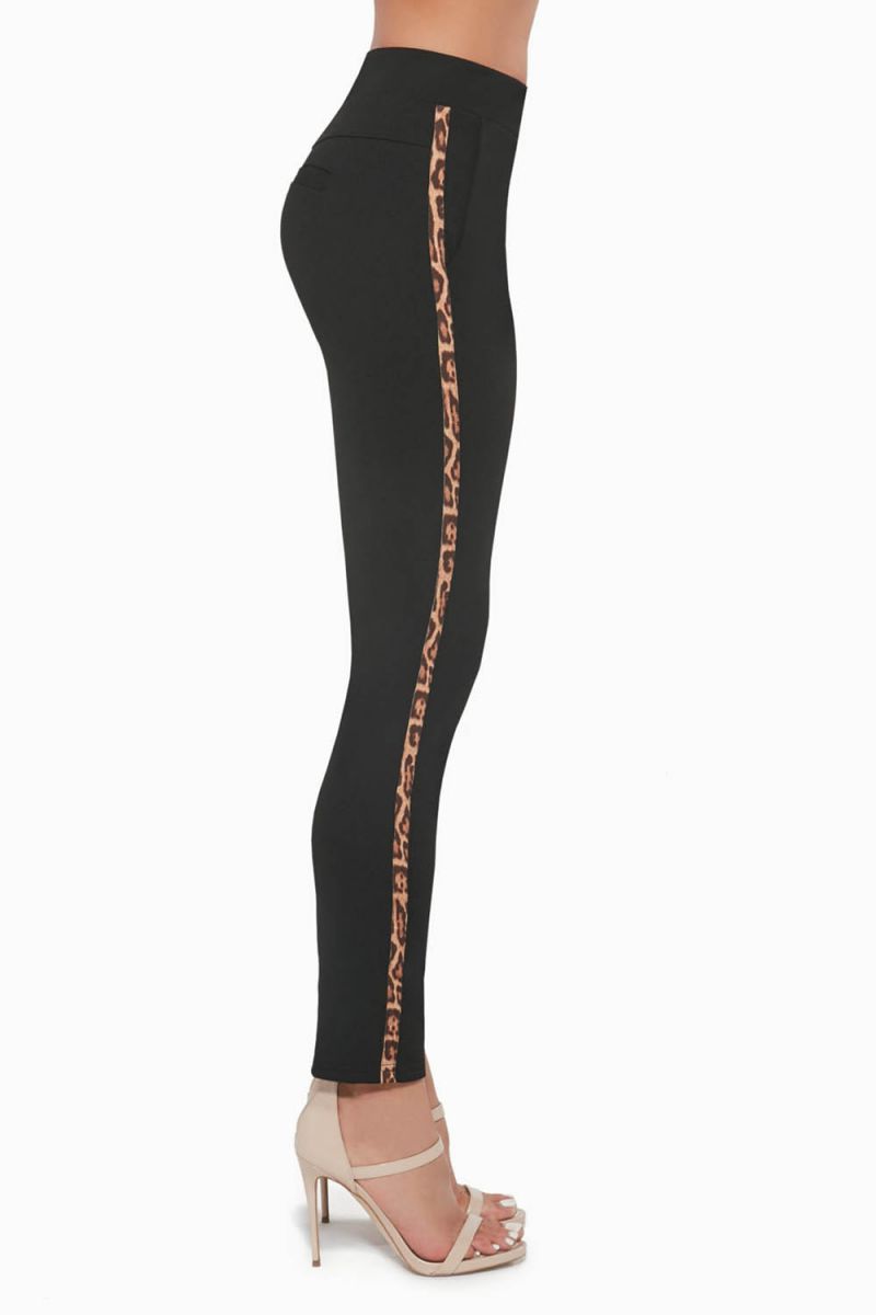- Уникальный дизайн: Леопардовые лампасы делают модель стильной и необычной, выделяя ее среди простых однотонных брюк.