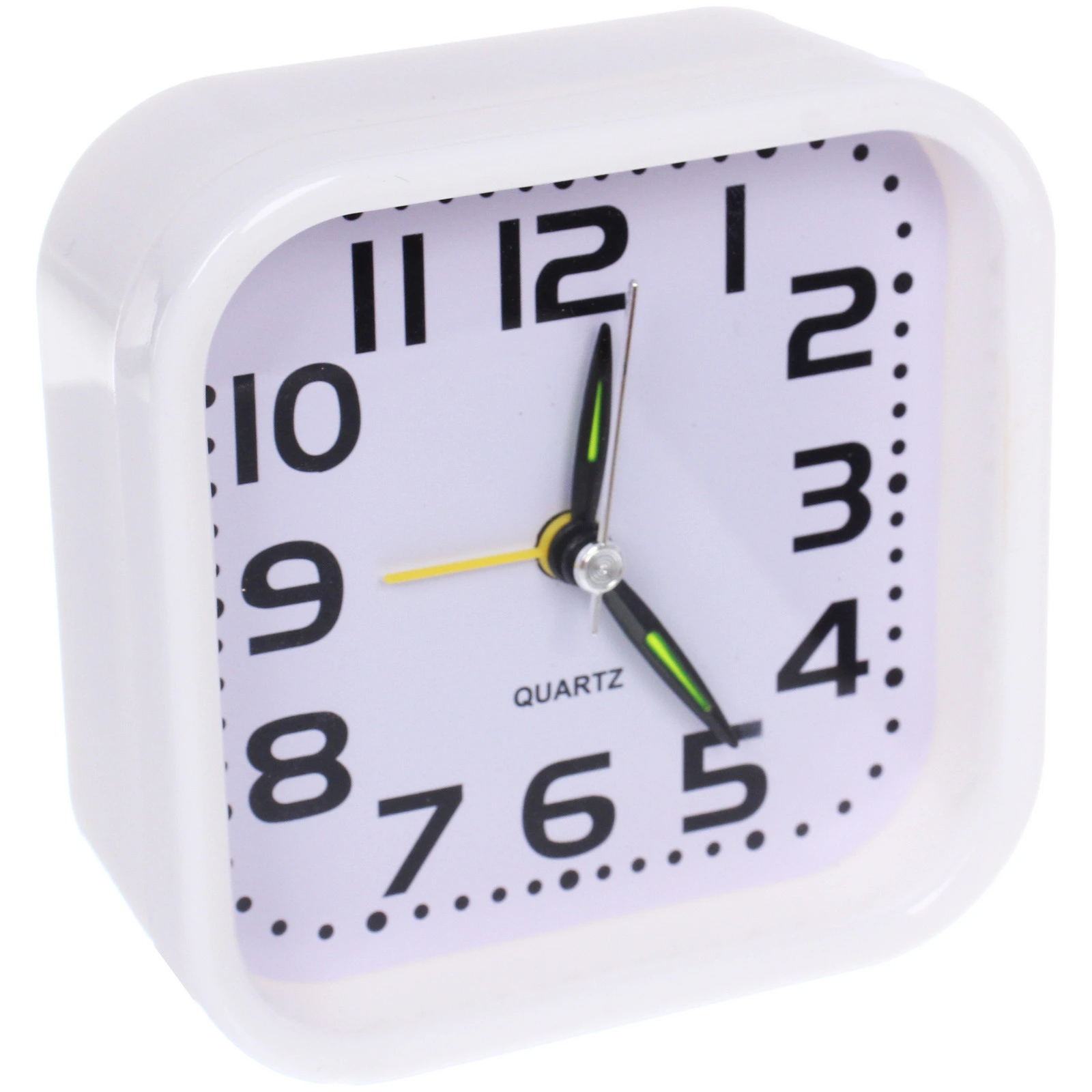 Кварцевый механизм обеспечивает стабильный ход времени, а крупные арабские цифры на контрастном циферблате хорошо читаются даже на расстоянии. Отдельная стрелка будильника позволяет точно настроить время сигнала. На задней панели расположены колесики для установки текущего времени и сигнала, а также переключатель включения и выключения звонка.