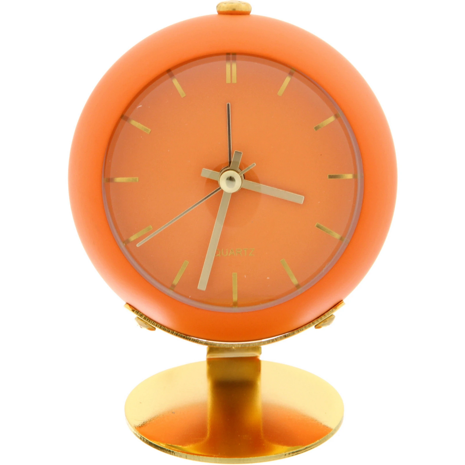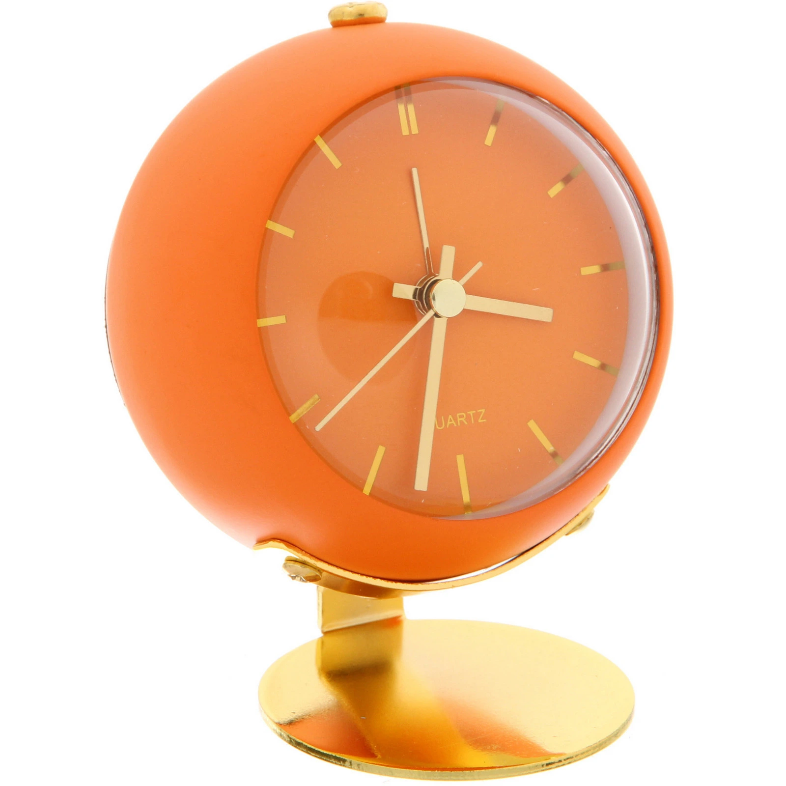 - Яркий дизайн: круглый оранжевый корпус с золотистой подставкой и стрелками станет стильным акцентом на прикроватной тумбе, рабочем столе или полке.
