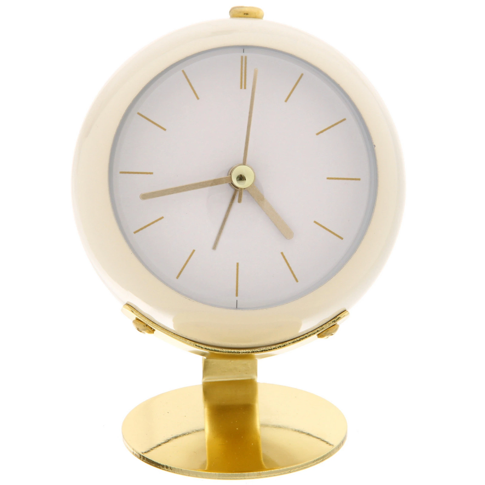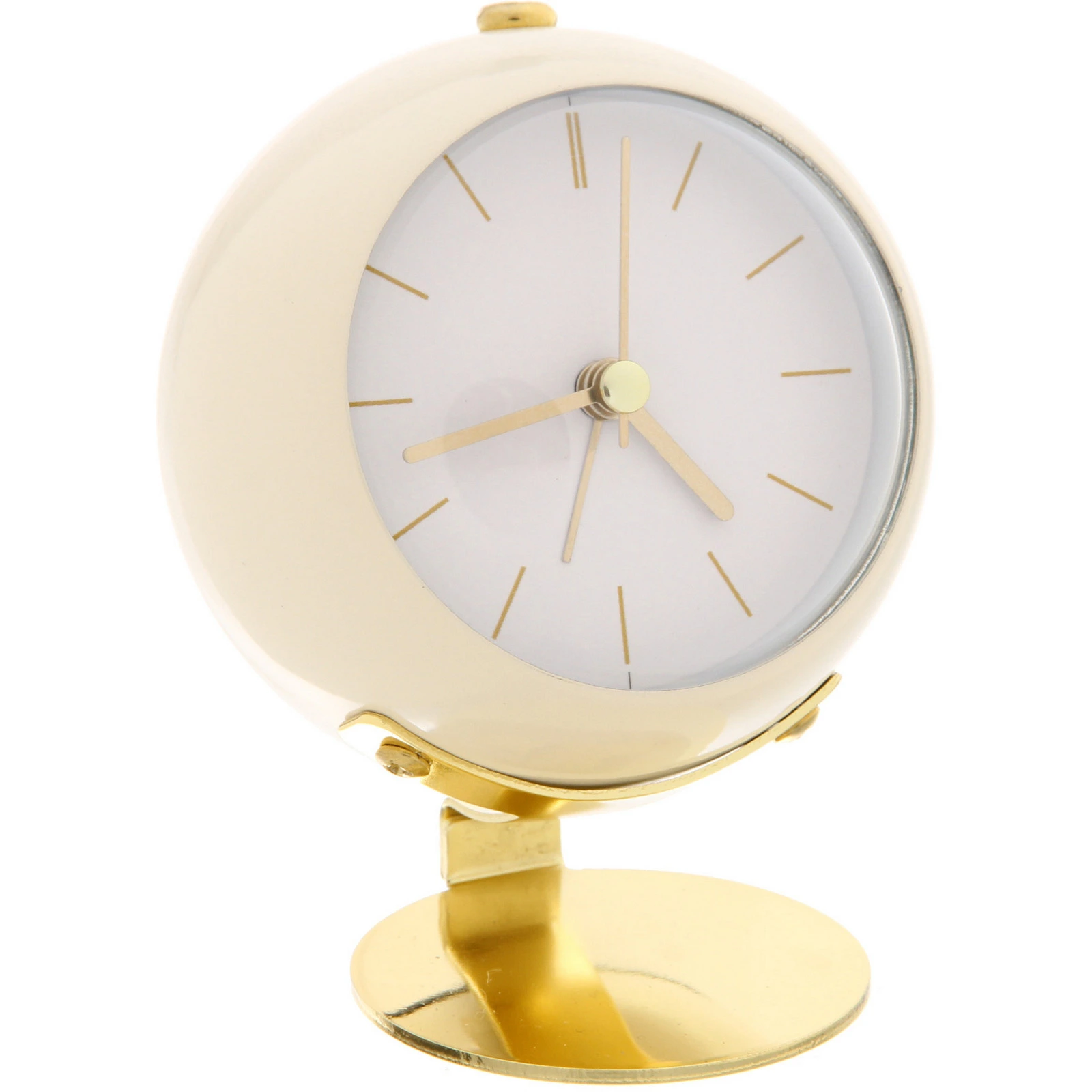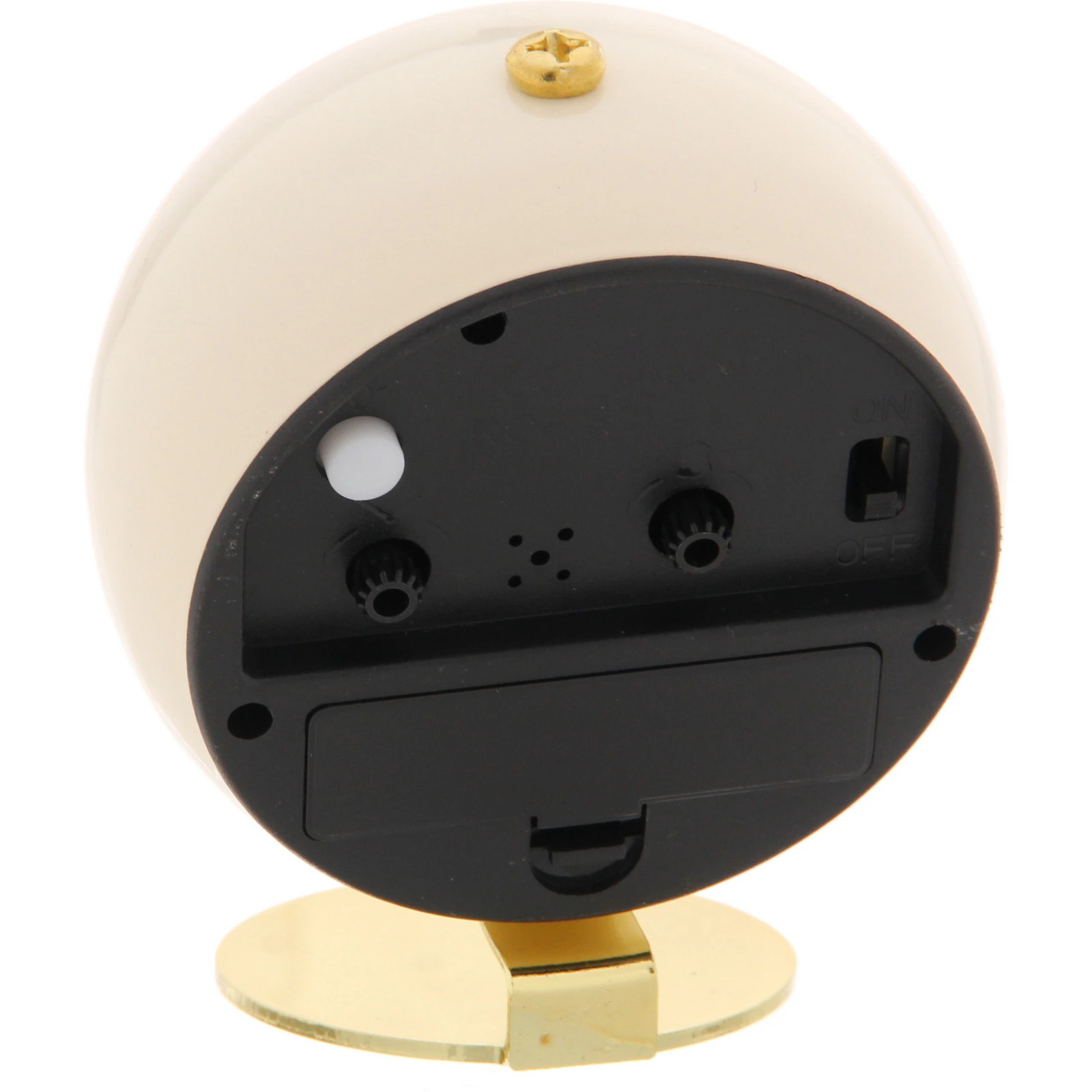 Будильник имеет круглый корпус из пластика с глянцевой поверхностью приятного сливочного оттенка. Циферблат белого цвета украшен тонкими позолоченными метками. Все три стрелки (часовая, минутная и секундная) также выполнены в золотистом цвете. Устройство устанавливается на элегантную подставку из металла с золотистым покрытием, которая придает ему устойчивость и завершенный вид. Задняя панель черного цвета содержит все необходимые органы управления.