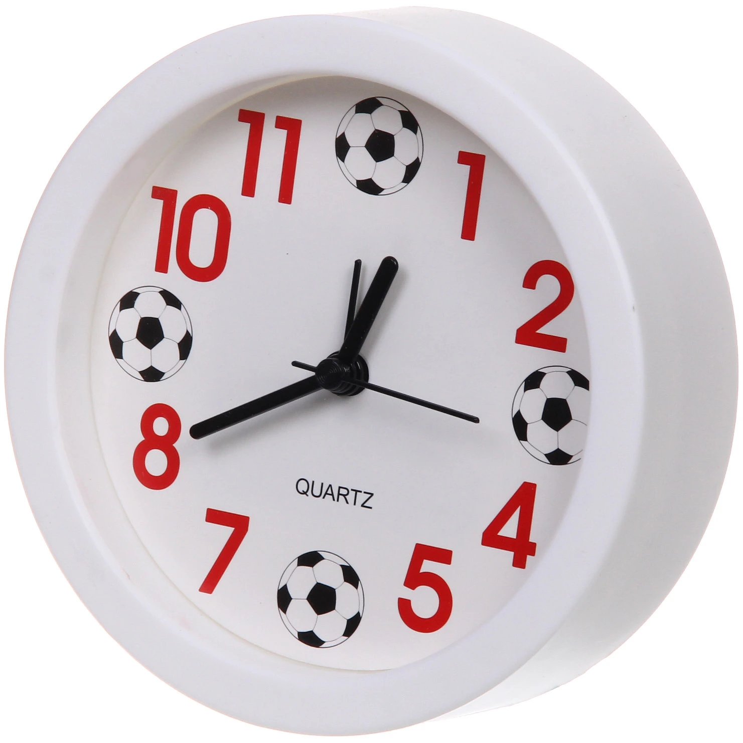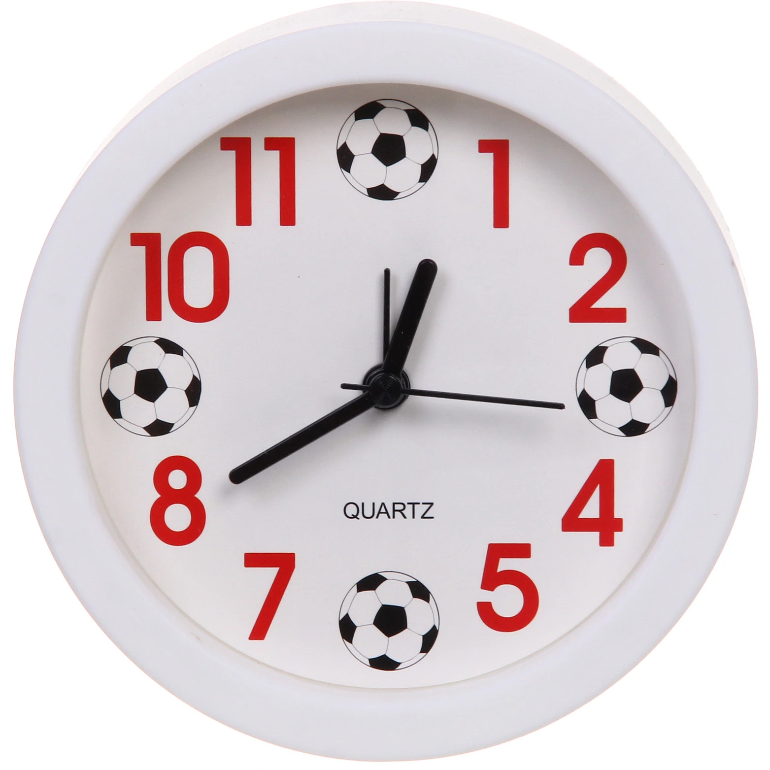 Модель оснащена современным кварцевым механизмом, который обеспечивает точный ход и долговечность службы. Циферблат оформлен в уникальном тематическом стиле: классические цифры 3, 6, 9 и 12 заменены изображениями футбольных мячей. Контрастные красные арабские цифры и черные стрелки отчетливо видны на белом фоне, что позволяет легко считывать время даже при беглом взгляде.