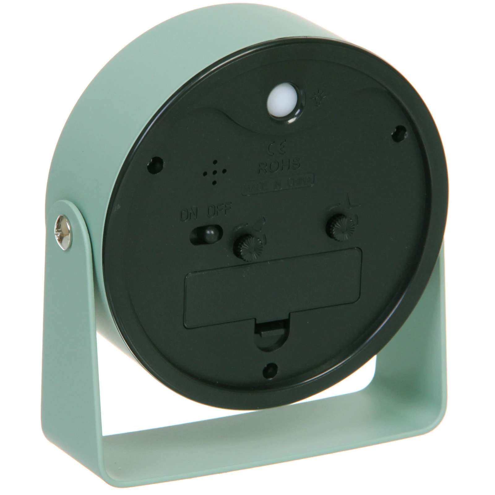 Будильник оснащён механизмом установки сигнала, который легко настраивается с помощью регуляторов на задней панели. Функция включения и выключения сигнала переключателем делает использование максимально простым. Устойчивая П-образная подставка надёжно фиксирует часы на любой ровной поверхности: прикроватной тумбе, рабочем столе, полке или комоде.