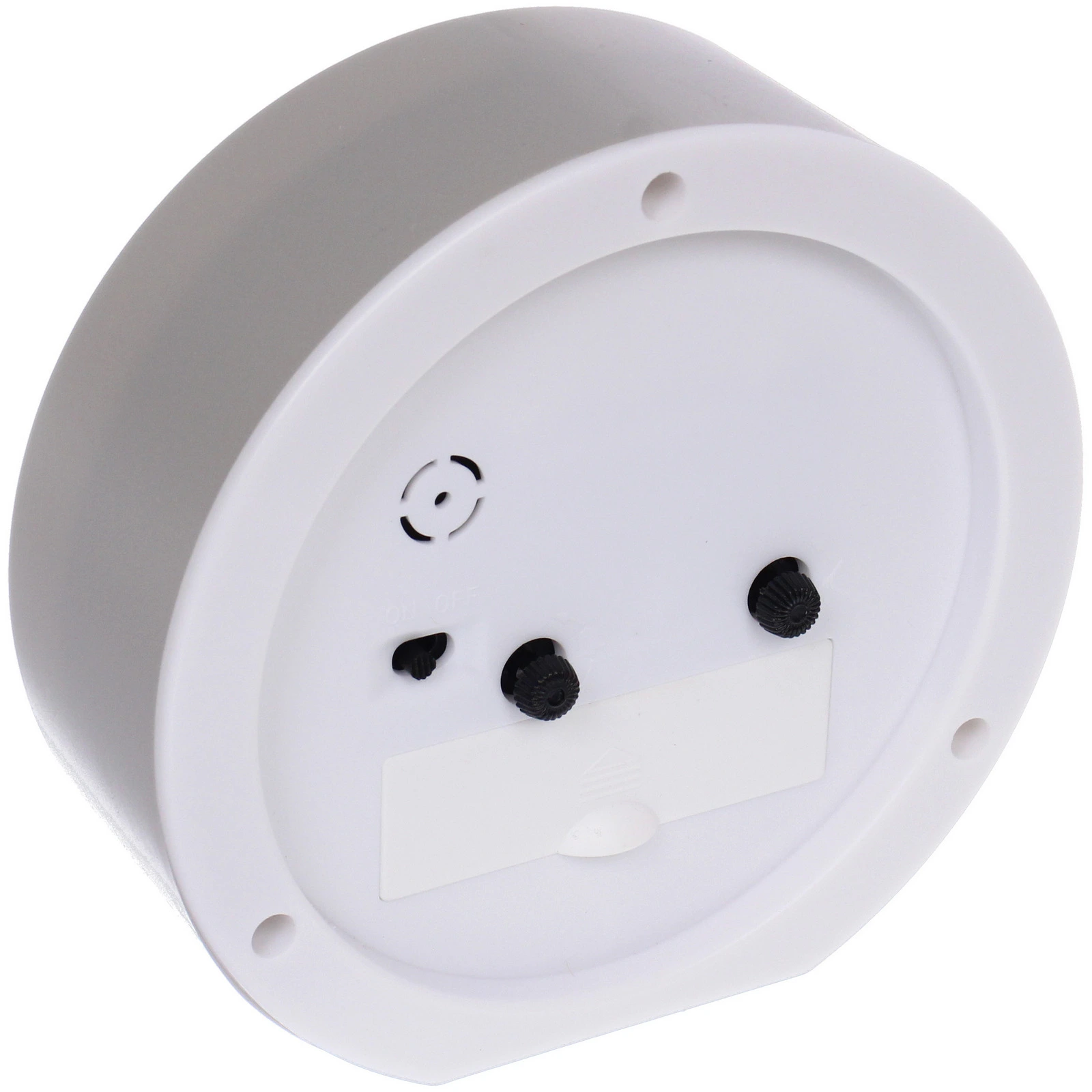 - Компактный и удобный. Диаметр корпуса составляет 10,5 см, а толщина — всего 4 см. Будильник не займёт много места, но будет всегда на виду.