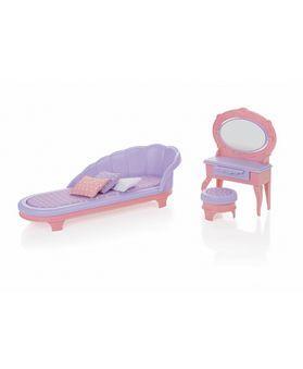 - Комплектация: туалетный столик с зеркалом, 2 табурета, диван, кукла в розовом платье