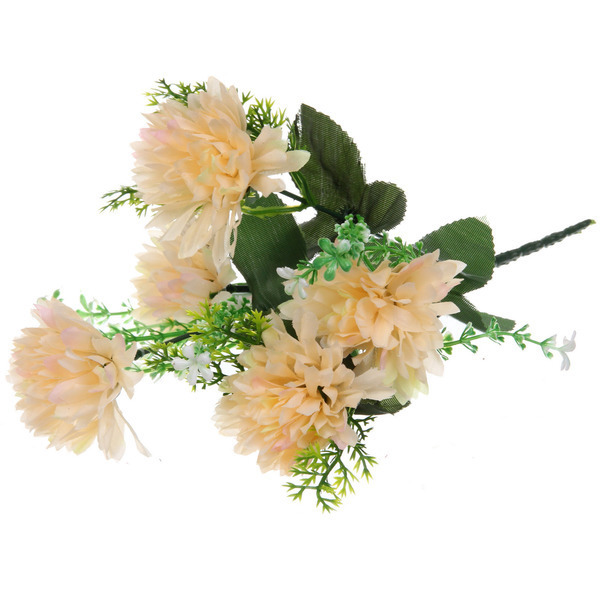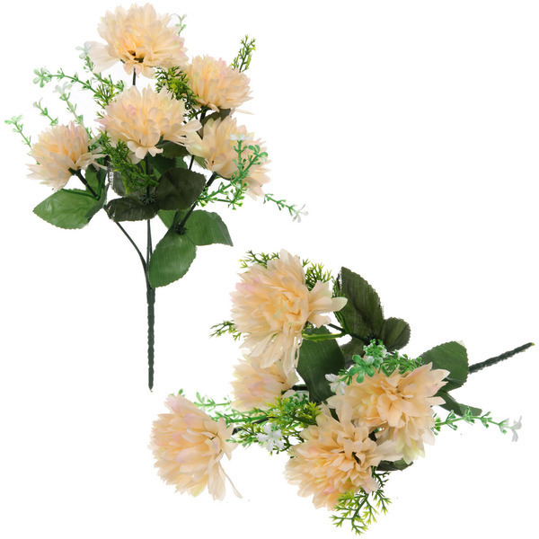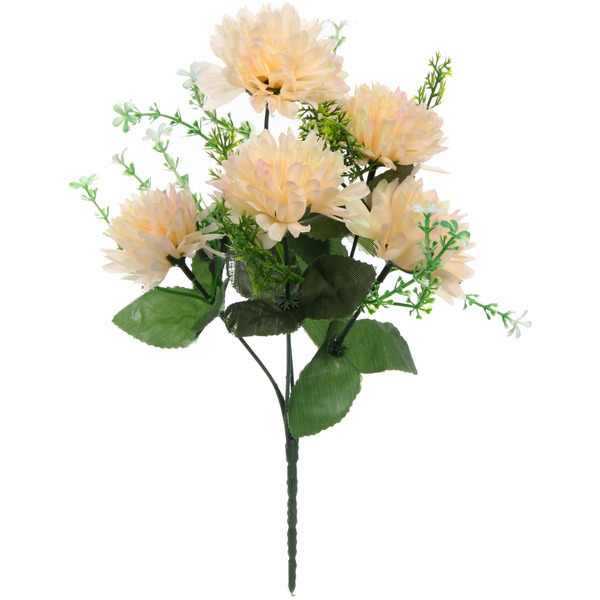 Цветки выполнены в форме распушенных хризантем с мелкими лепестками. В комплект входят зеленые листья и травянистые элементы, придающие композиции завершенность. Длина стеблей позволяет разместить букет в любой вазе.
