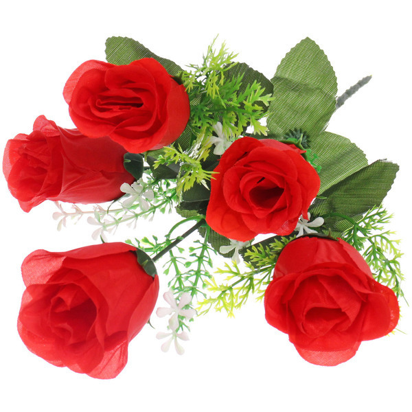 В состав букета входят 5 искусственных роз с красными лепестками, аккуратно оформленных дополнительной зеленью и малыми белыми цветками. Материал исполнения: пластик, полиэстер. Высота букета – 35 см, что удобно для размещения в различных по размеру вазах. Универсальный выбор для подарка, украшения праздничного стола или долгосрочного декора.