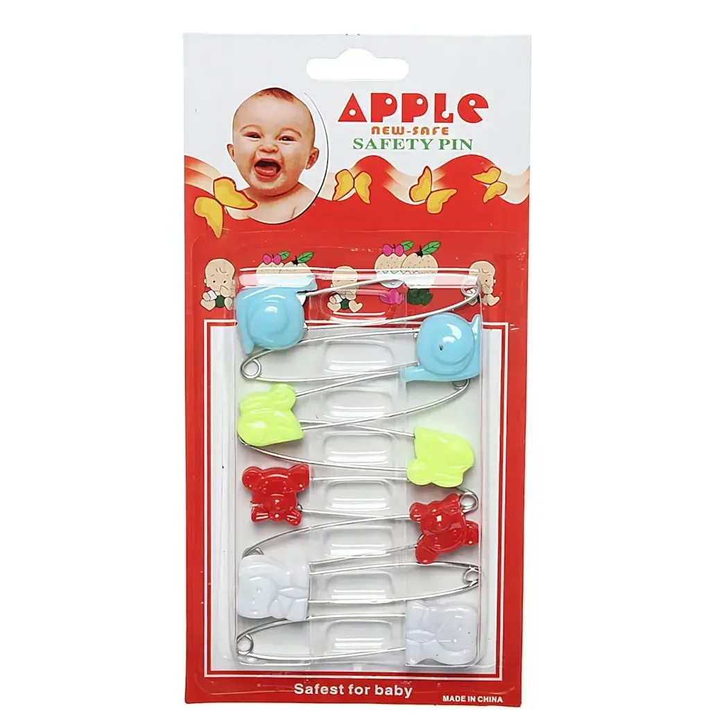 Размер каждой булавки составляет 5,5 см, что делает их удобными для маленьких ручек. Изготовлены из металла с пластиковыми декоративными наконечниками, они обеспечивают надежность и долговечность. Упаковка выполнена в ярких цветах и содержит изображения улыбающегося ребенка, что создает позитивное настроение.