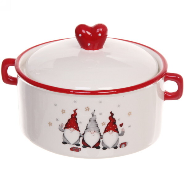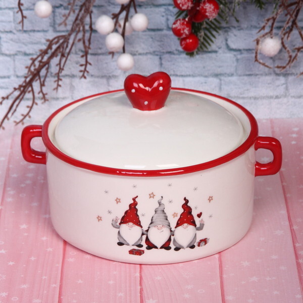 Создайте атмосферу праздника с помощью этой уникальной бульоницы, которая станет ярким акцентом на вашем новогоднем столе. Керамическая бульоница объемом 700 мл выполнена в белом цвете с красными элементами и изображением милых гномов, что добавляет ей особый шарм и уют. Она не только красива, но и практична, что делает её идеальным выбором для праздничного застолья.