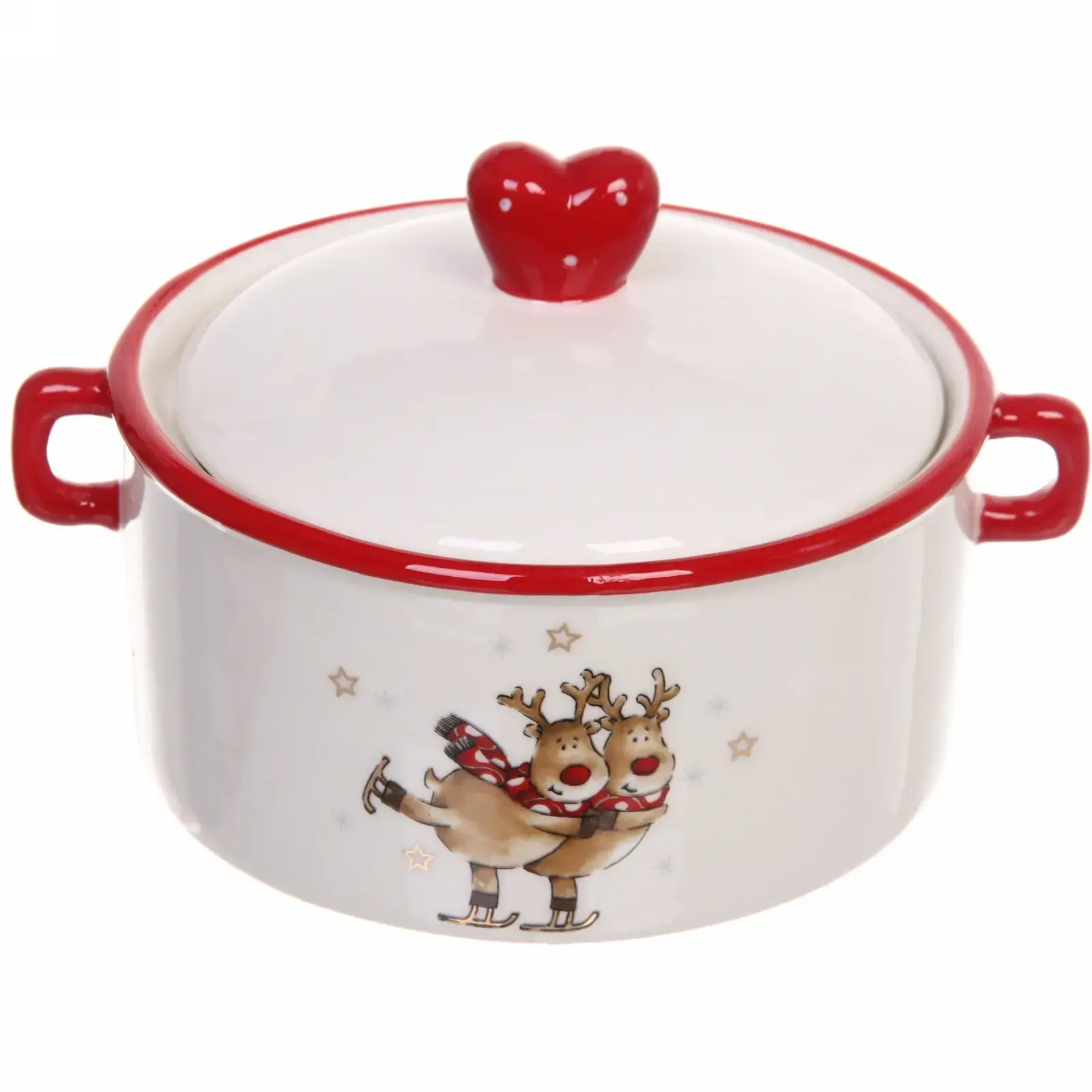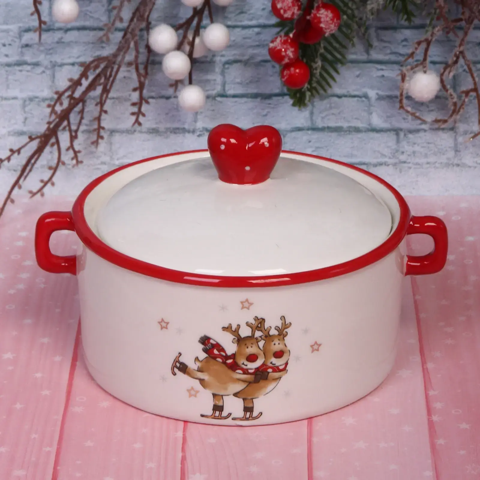 Создайте атмосферу зимней сказки с керамической бульоницей, которая станет центром новогоднего стола. Яркие иллюстрации с оленями и золотыми звёздами подчеркнут тематику праздника, а практичная форма обеспечит удобство использования.
