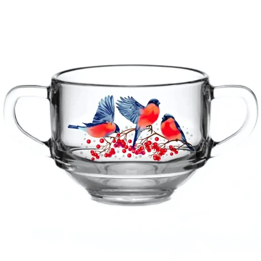 Бульонница стеклянная 480мл «снегири», глубокая форма, две ручки, яркий новогодний дизайн, прочное стекло