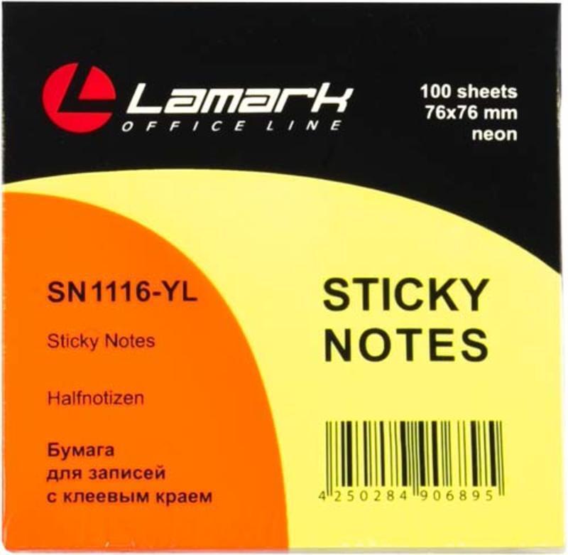Бумага для заметок самоклеящаяся, 76х76 мм, неон желтый, 100 листов, надежное крепление — Lamark