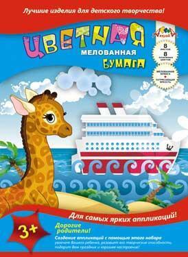 Цветная мелованная бумага А4, 8 листов/8 цветов, серия 'Жирафик и пароход', плотность 60 г/м2