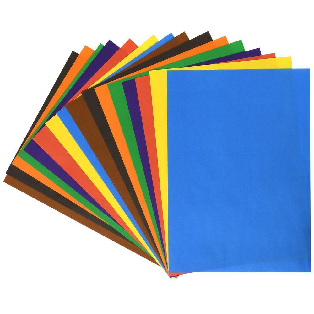 Размер листов А4 (210х297 мм), в упаковке 16 листов, 8 ярких цветов: красный, оранжевый, желтый, голубой, зеленый, фиолетовый, коричневый и черный.