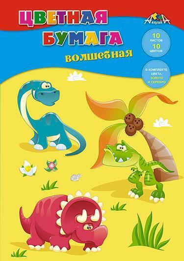 Набор цветной бумаги «Динозаврики» А4, 10 листов, 10 цветов с золотом и серебром, плотность 50 г/м²