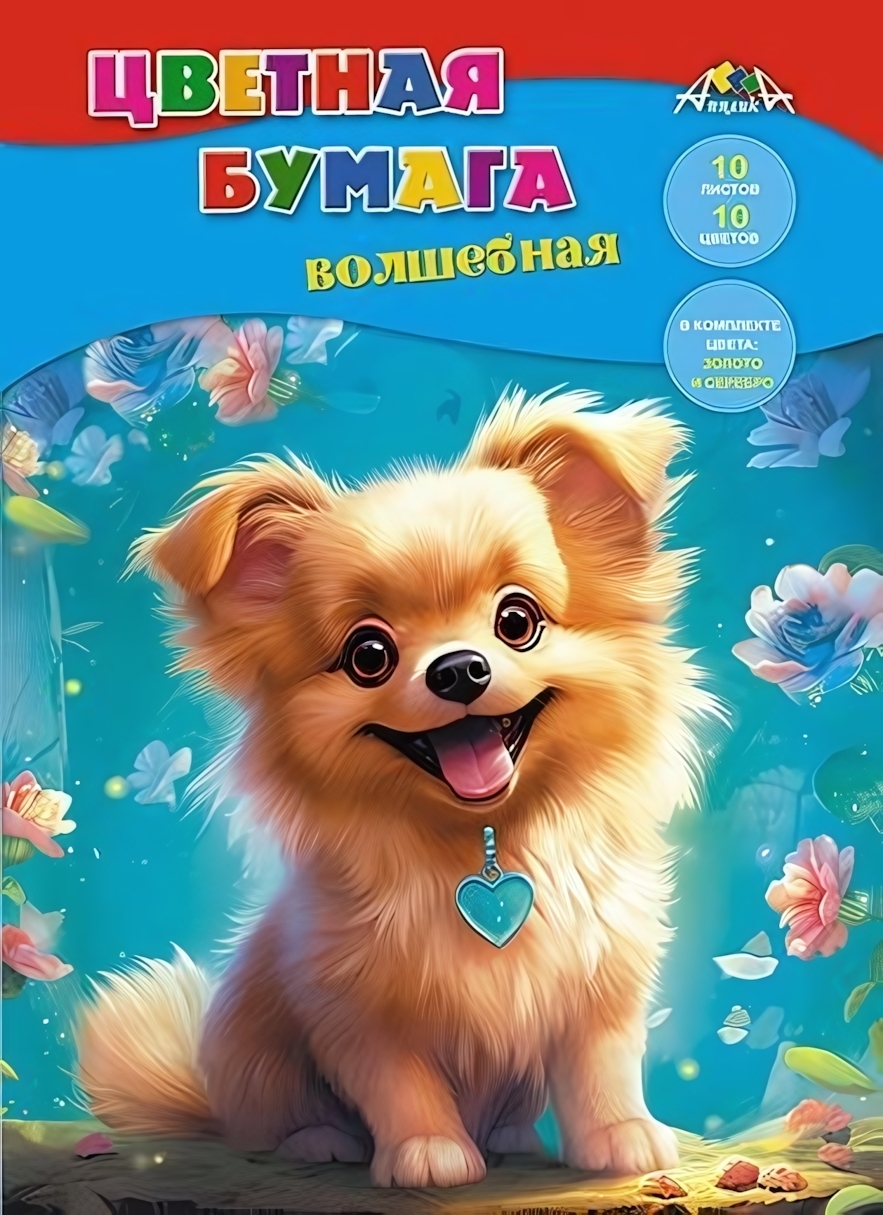 Цветная бумага «Веселый щенок», А4, 10 листов, 10 цветов, мелованные золото и серебро, 50 г/м²