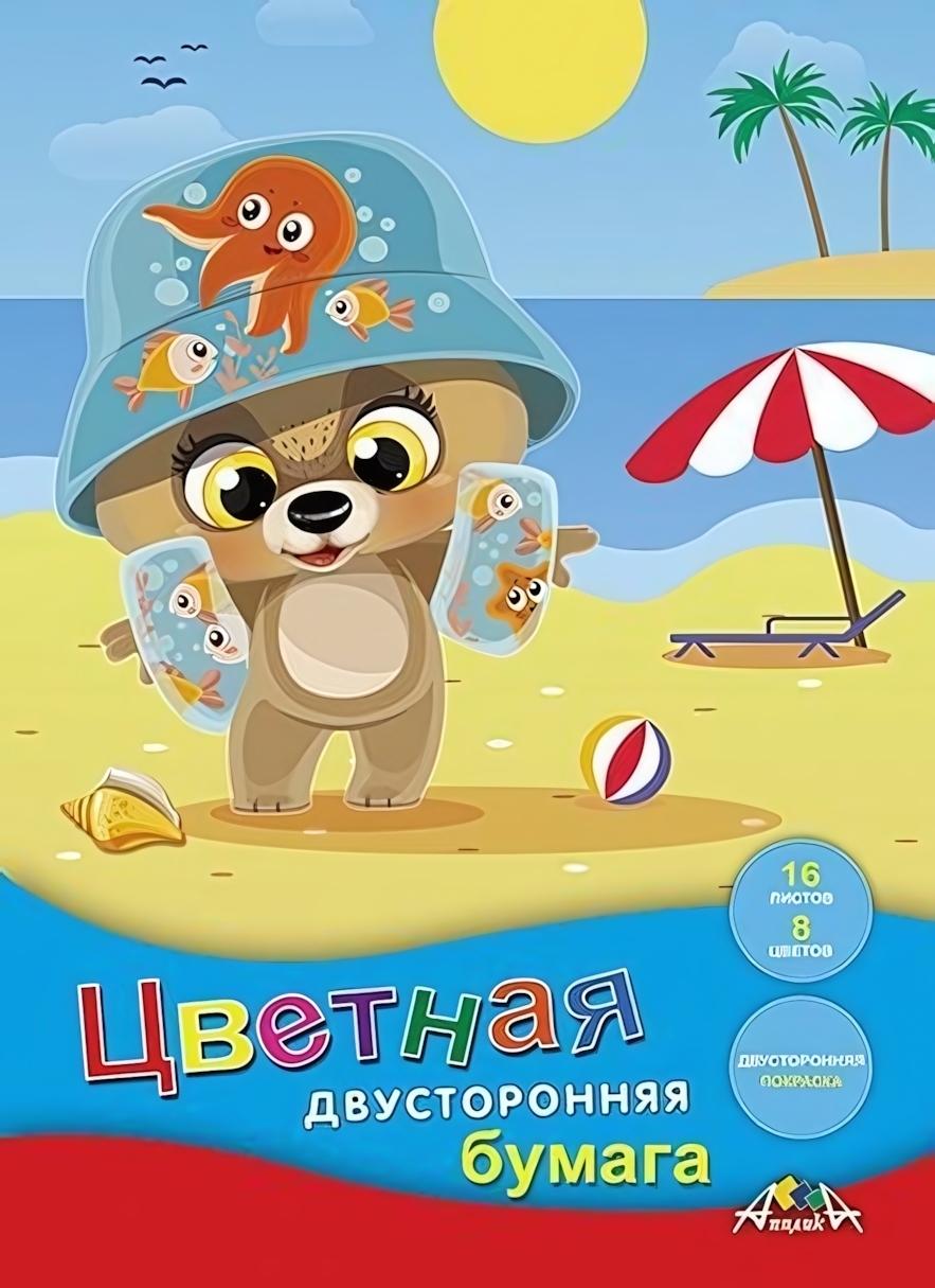 Бумага цветная А4, 16 листов, 8 цветов, двусторонняя "Щенок на пляже" для творчества и аппликаций