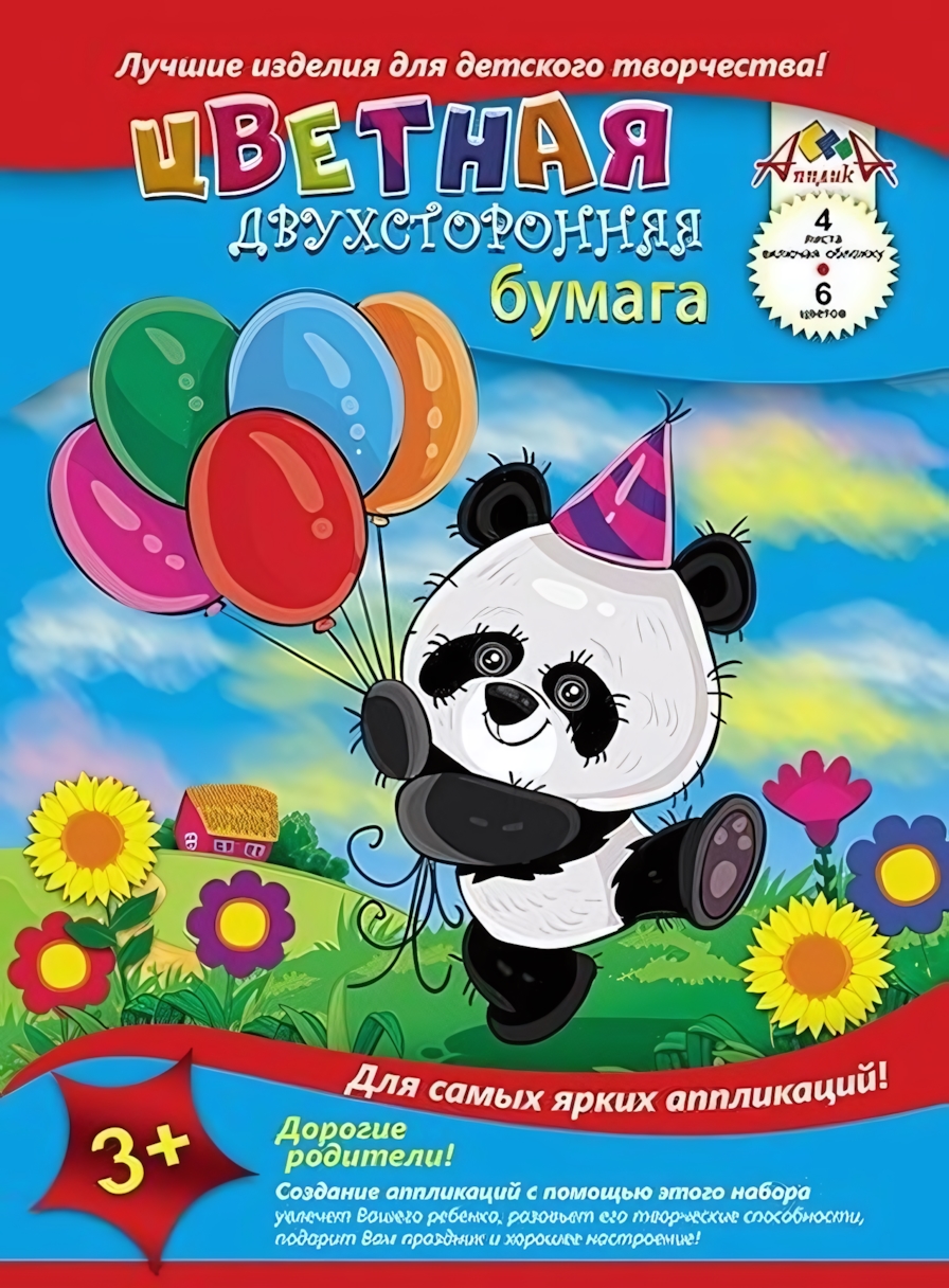 Бумага цветная А4, 4 листа, 6 цветов, двусторонняя "Панда" – для творчества и аппликаций