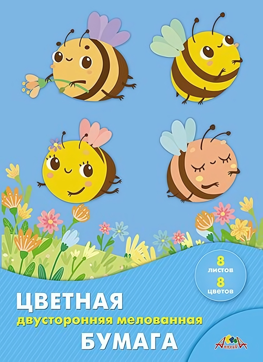 Бумага цветная мелованная А4, 8 листов/8 цветов, двусторонняя, плотность 60 гр/м2