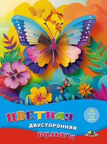 Цветная двусторонняя бумага А4 16л, 16 цветов «Яркая бабочка» для творчества и аппликаций