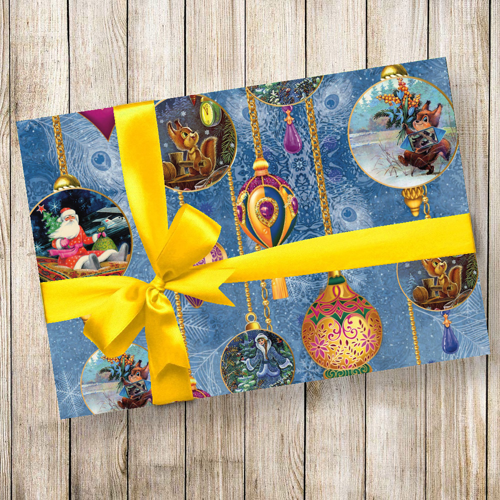 Дизайн с узнаваемыми советскими игрушками создаёт тёплую атмосферу семейных праздников. Бумага подходит для машинной печати — используйте штампы или надписи для персонализации. Экологичный материал безопасен для детского творчества и хрупких предметов.