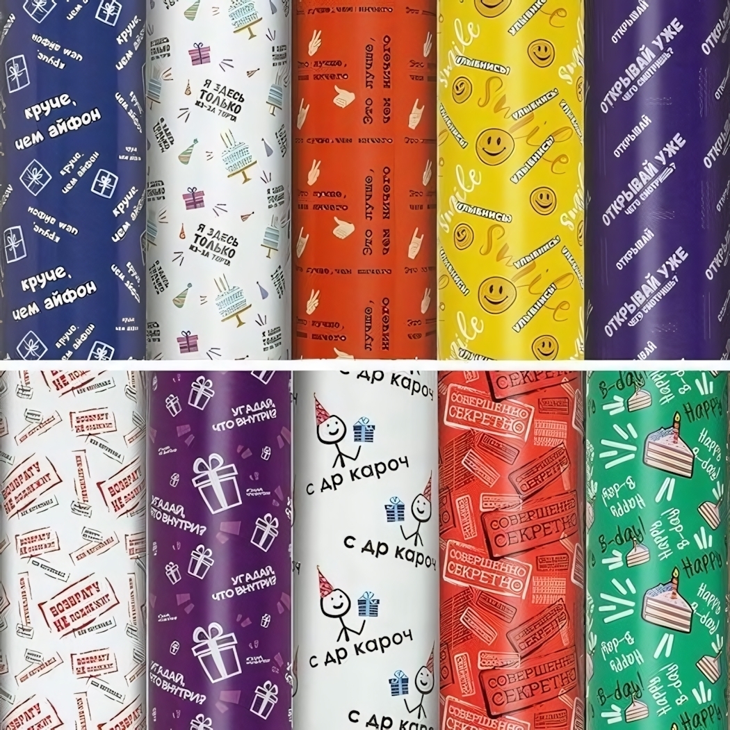 Каждый рулон — это готовое дизайнерское решение с юмористическими фразами и праздничными мотивами. Широкий ассортимент принтов позволяет подобрать оформление под характер получателя и повод: