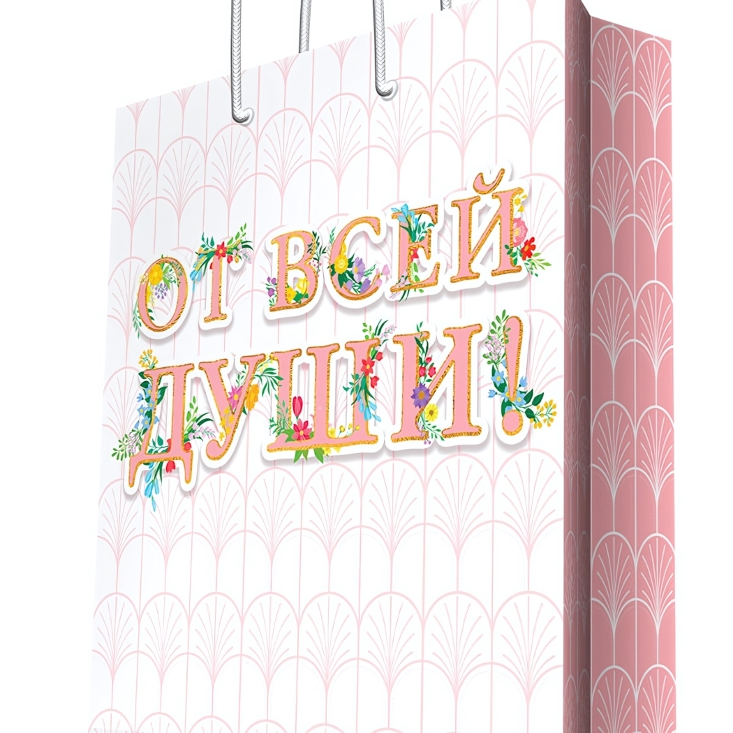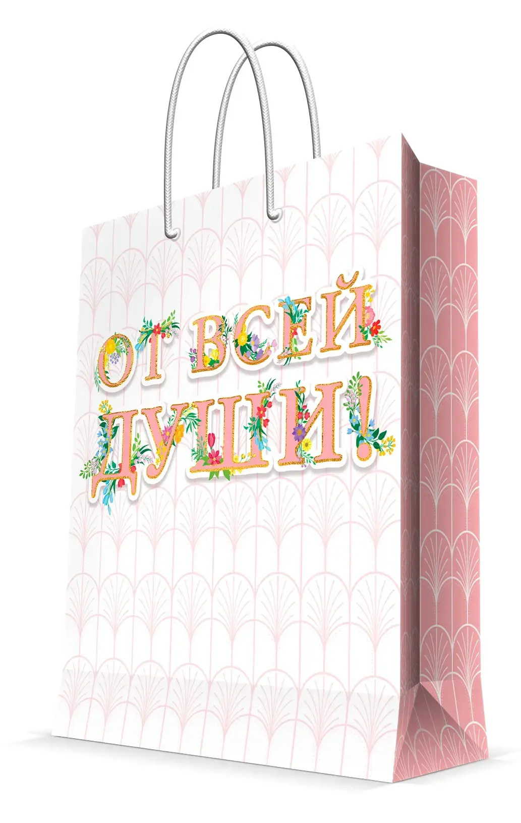 Пакет подходит для упаковки подарков на дни рождения, свадьбы, праздники и другие важные события. Его объемная форма и прочные ручки из металлической проволоки, обернутые в бумагу, обеспечивают удобство при переноске. Яркий дизайн с текстом «от всей души!» и цветочными элементами делает его привлекательным и запоминающимся.