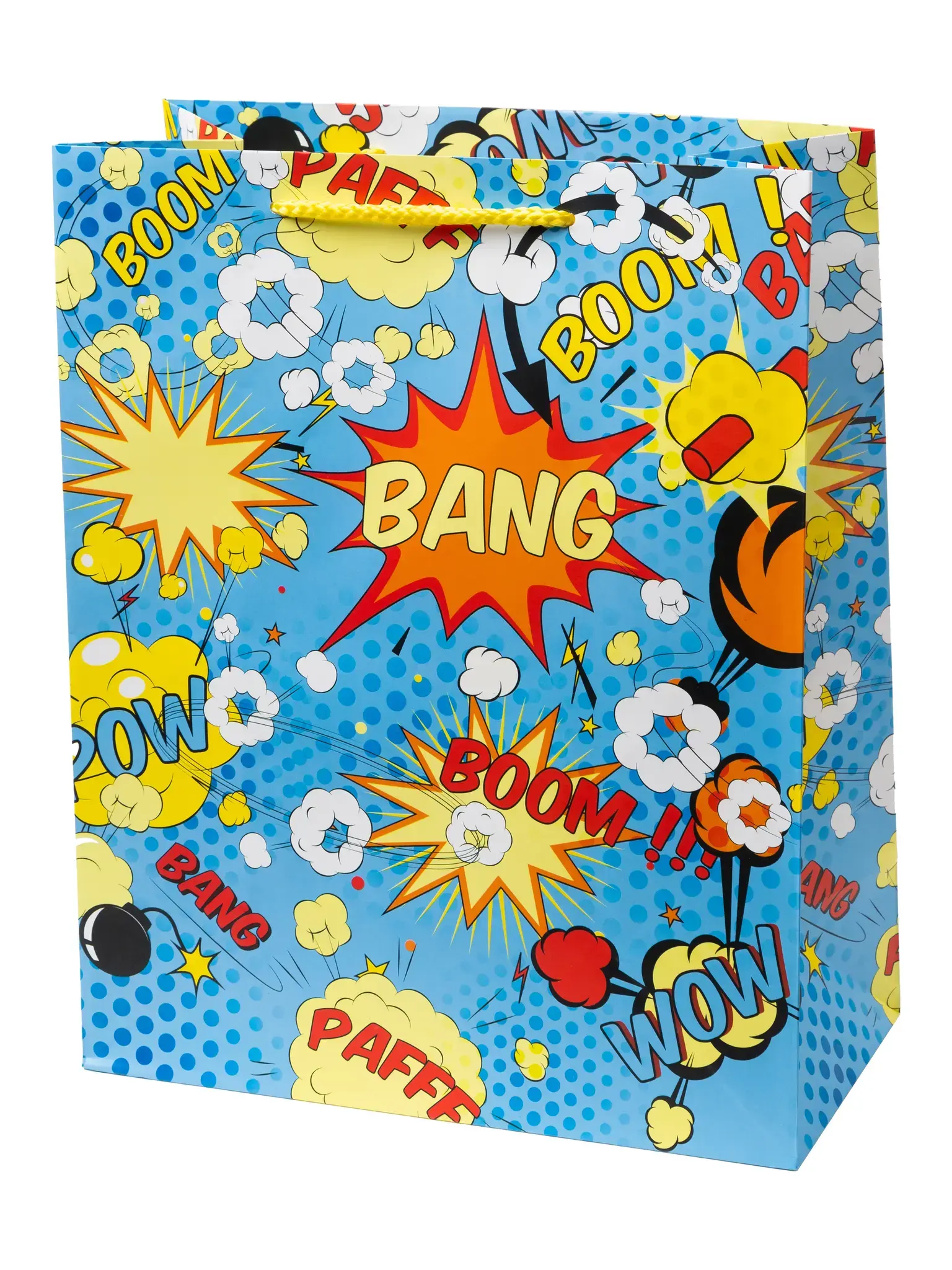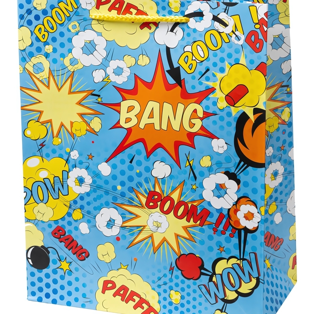 Выбирая наш бумажный пакет, вы получаете не только красивую, но и практичную упаковку. Яркий дизайн с комиксовыми элементами и надписями, такими как 'BANG', 'WOW', 'BOOM', делает его привлекательным для детей и взрослых. Ручки из желтой веревки обеспечивают удобство при переноске, а глянцевая поверхность добавляет блеска и стиля.