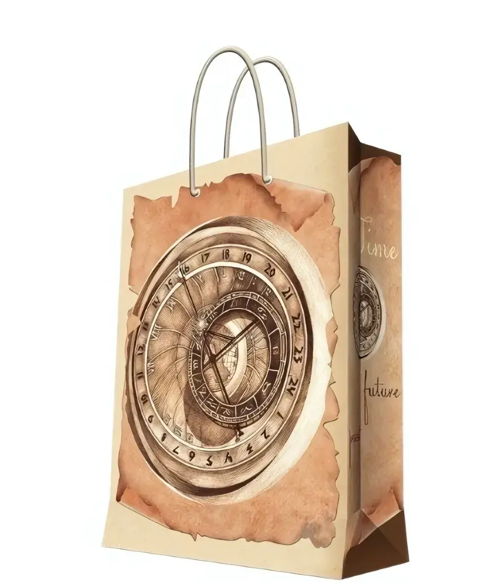 Выбирая этот бумажный пакет, вы получаете не только красивую, но и практичную упаковку. Плотность бумаги 140 г/м2 гарантирует долговечность и устойчивость к разрывам. Дизайн с изображением часов и надписью «Time is the key to the future» добавляет уникальности и привлекает внимание покупателей. Такой пакет станет отличным дополнением к вашему ассортименту и подчеркнет статус вашего бренда.