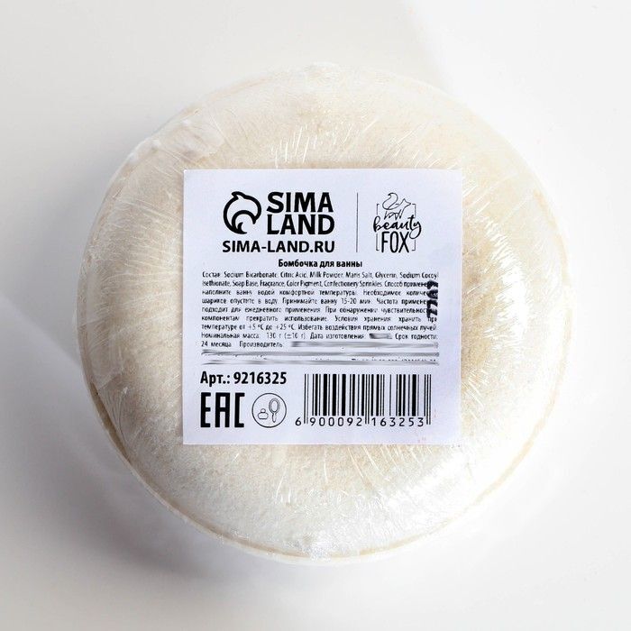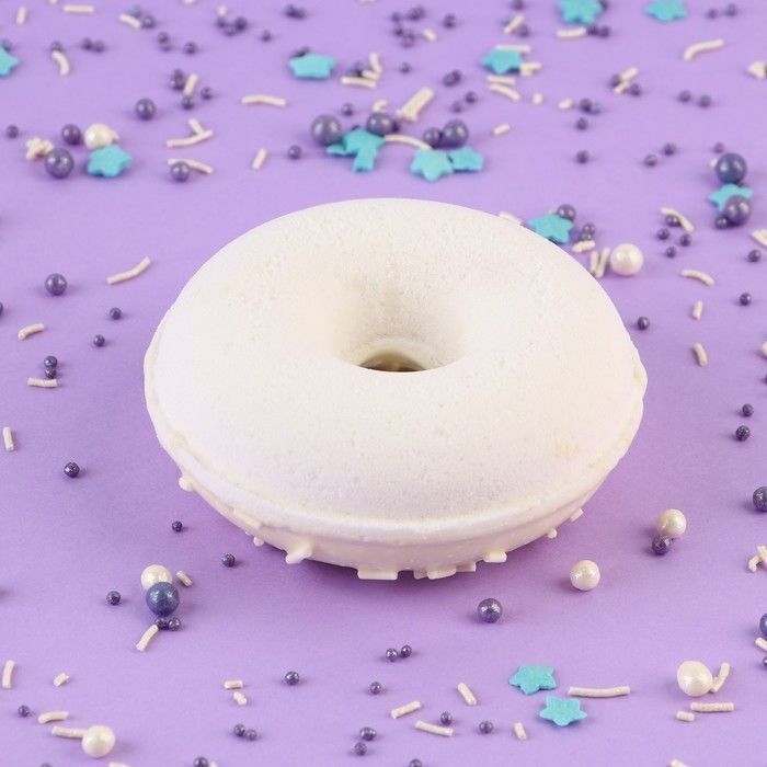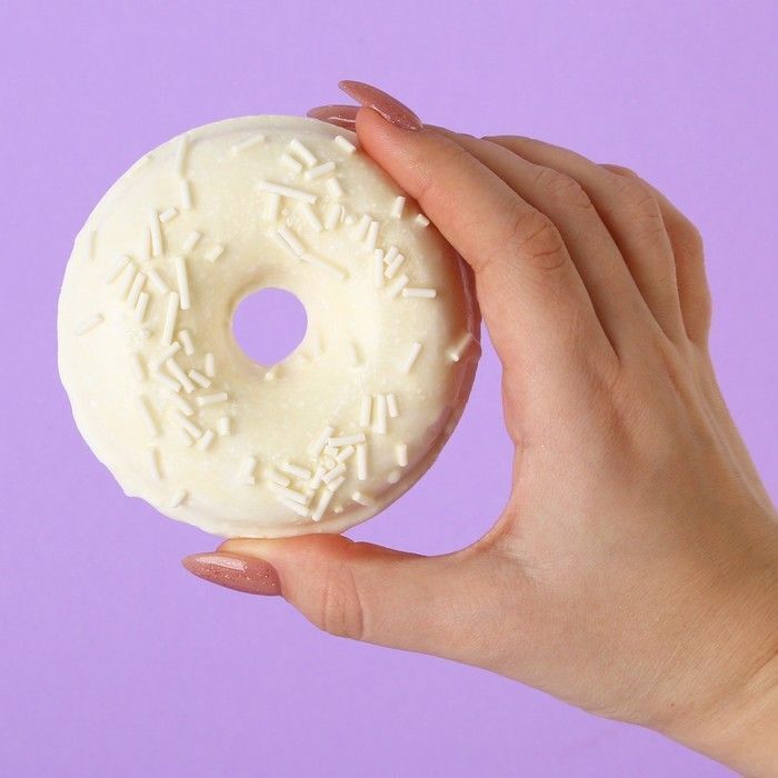 Пончик имеет гладкую поверхность и округлую форму с центральным отверстием, что делает его удобным в использовании. Его светлый цвет с белой глазурью и посыпкой из мелких стружек добавляет эстетическую привлекательность. Этот продукт произведен в России под брендом Beauty Fox, что гарантирует высокое качество и безопасность.