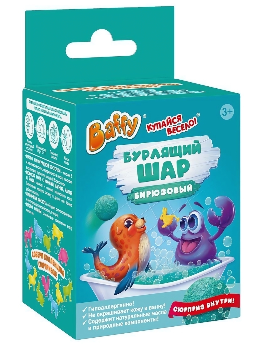 Бурлящий шар подходит для детей старше 3 лет и станет отличным дополнением к вечернему купанию. Просто бросьте шар в воду, и он начнет бурлить, окрашивая воду в приятный бирюзовый цвет и наполняя ванну ароматом. Внутри шара скрыт сюрприз, который обязательно порадует вашего малыша и добавит элемент неожиданности в процесс купания.