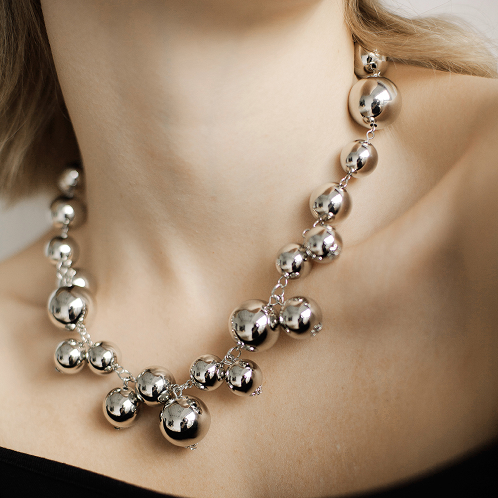 Погрузитесь в мир стиля и элегантности с нашими бусами, которые станут идеальным дополнением к вашему образу. Эти бусы с крупными металлическими шарами не только привлекают внимание, но и подчеркивают вашу индивидуальность. Блестящая поверхность и асимметричный дизайн делают их универсальными для любого случая — будь то вечерний выход или повседневная прогулка.