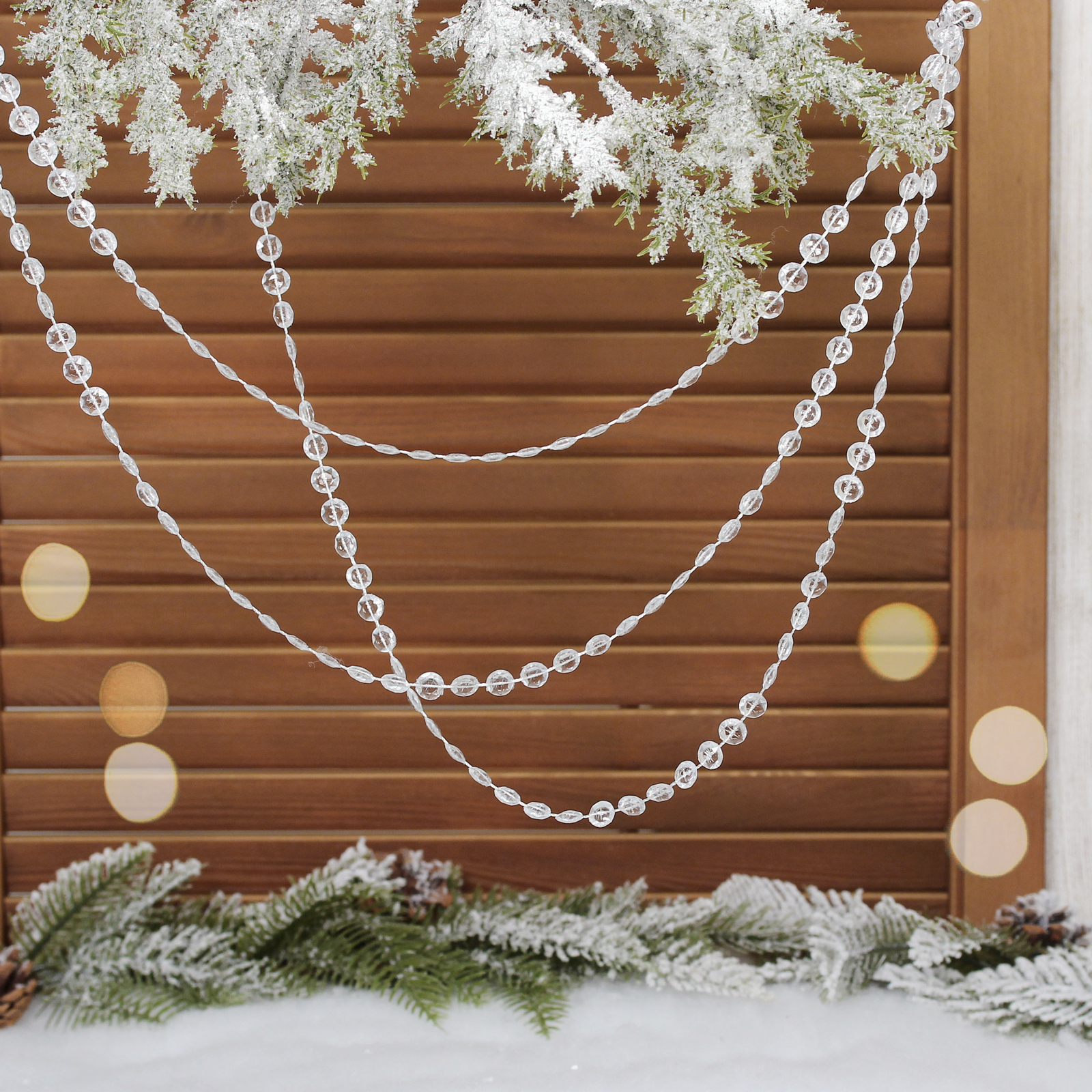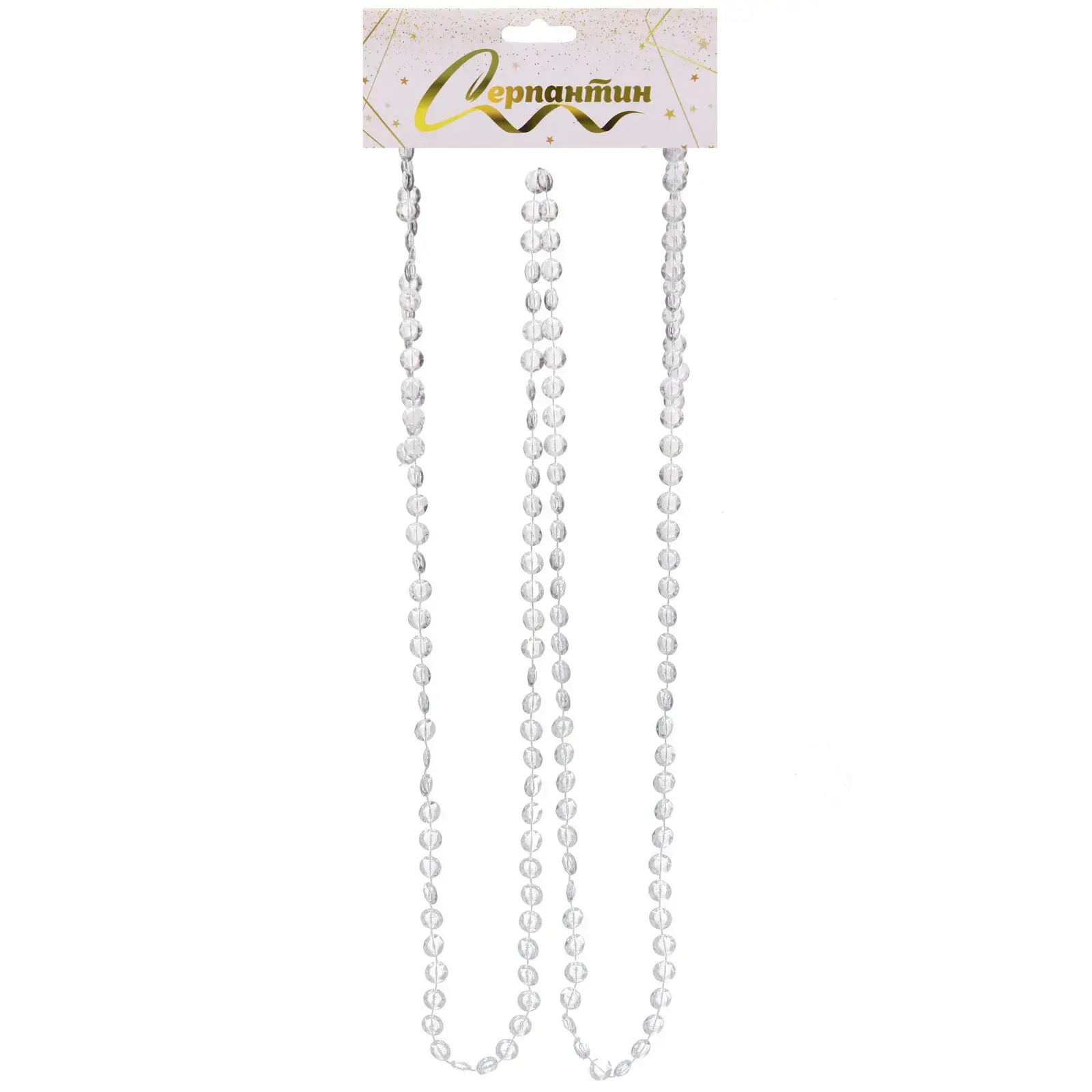 Длина каждой нити составляет 2 метра, что позволяет красиво оформить даже высокие ёлки. Прозрачные бусины одинакового размера создают гармоничную композицию.