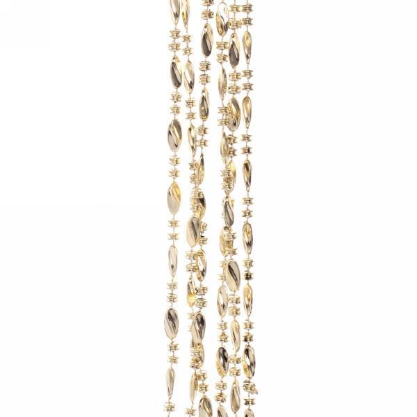 Декоративная цепочка состоит из овальных элементов с гладкой поверхностью и небольших разделительных бусин, равномерно распределенных по всей длине. Оттенок шампань с мягким блеском придает аксессуару утончённость, а сама конструкция не цепляется за игрушки и хвою, что облегчает процесс декорирования.