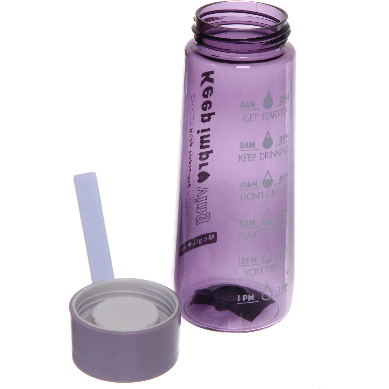 Цилиндрическая форма удобно лежит в руке, а завинчивающаяся крышка плотно закрывается, снижая риск проливания при переноске. Прочный пластик устойчив к повседневному использованию и прост в уходе. Полупрозрачный фиолетовый корпус позволяет контролировать уровень напитка внутри.