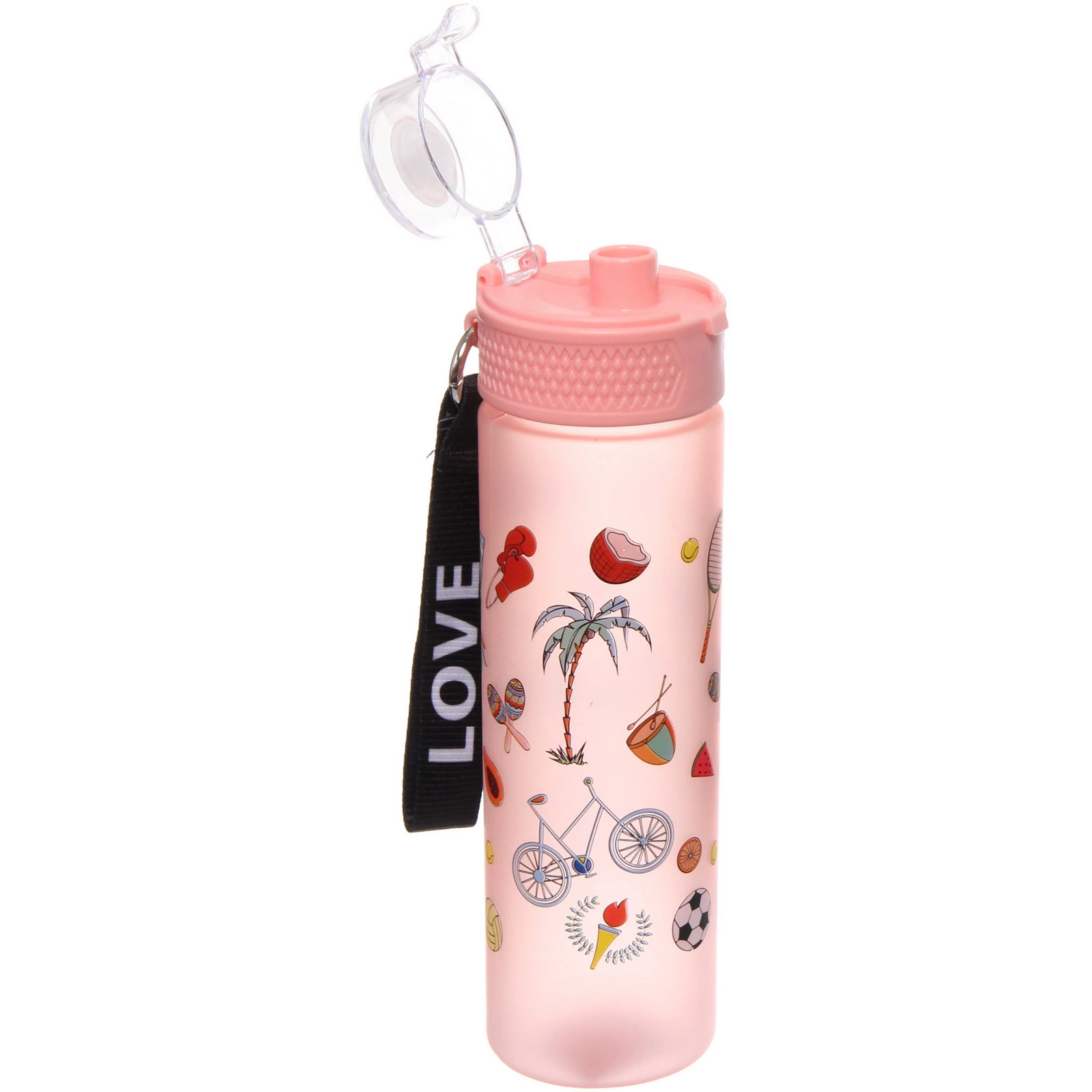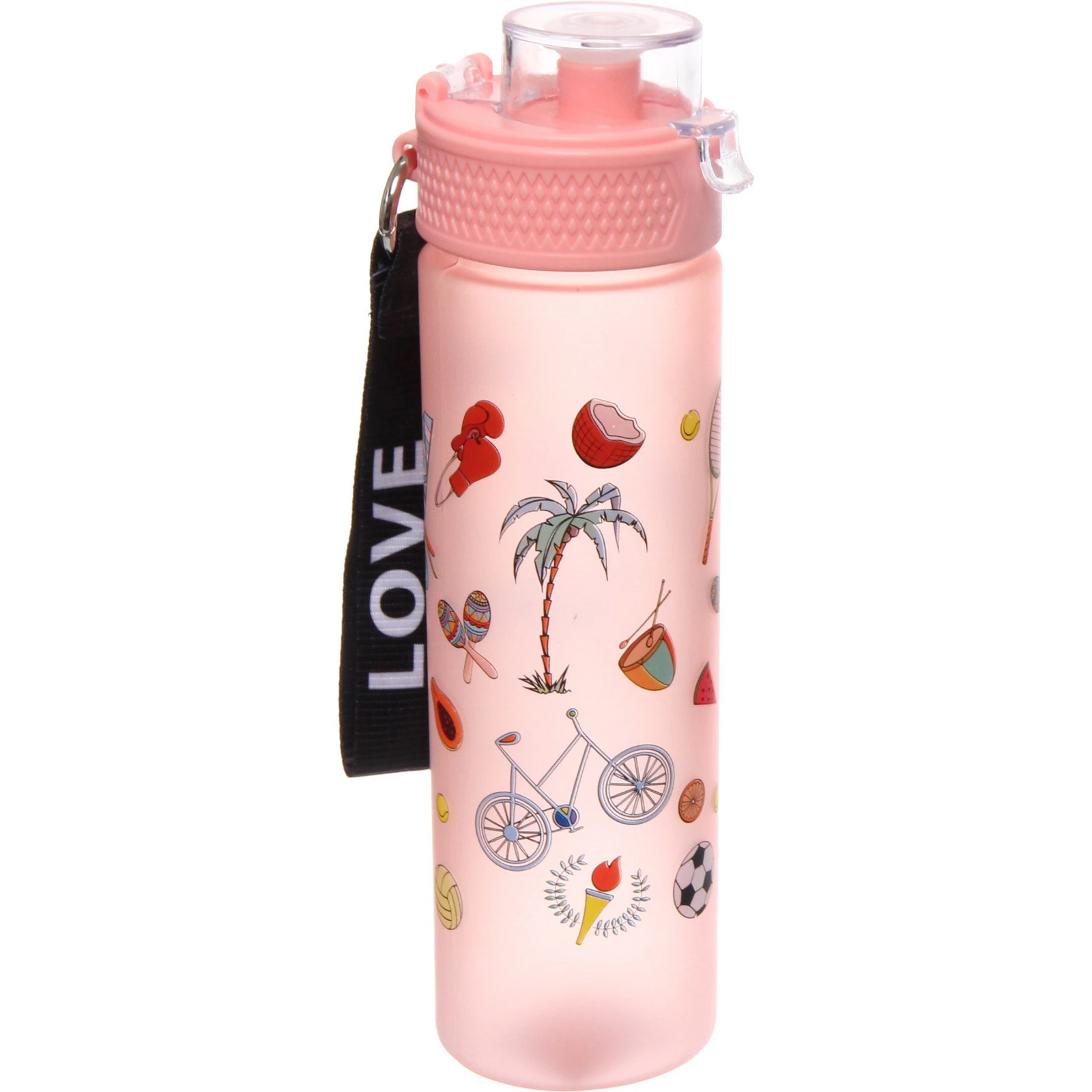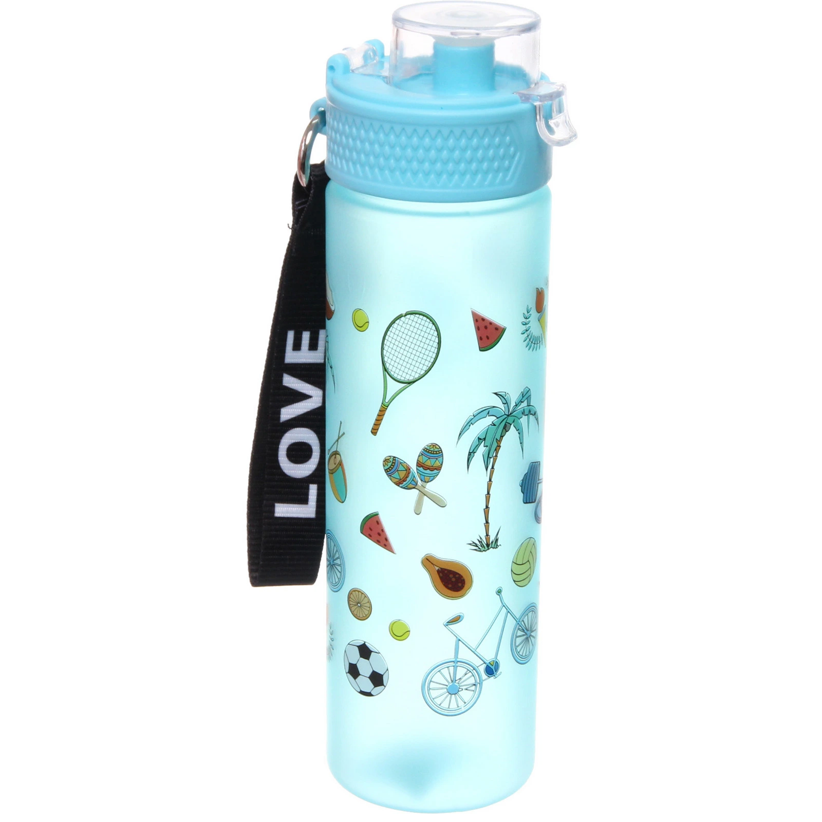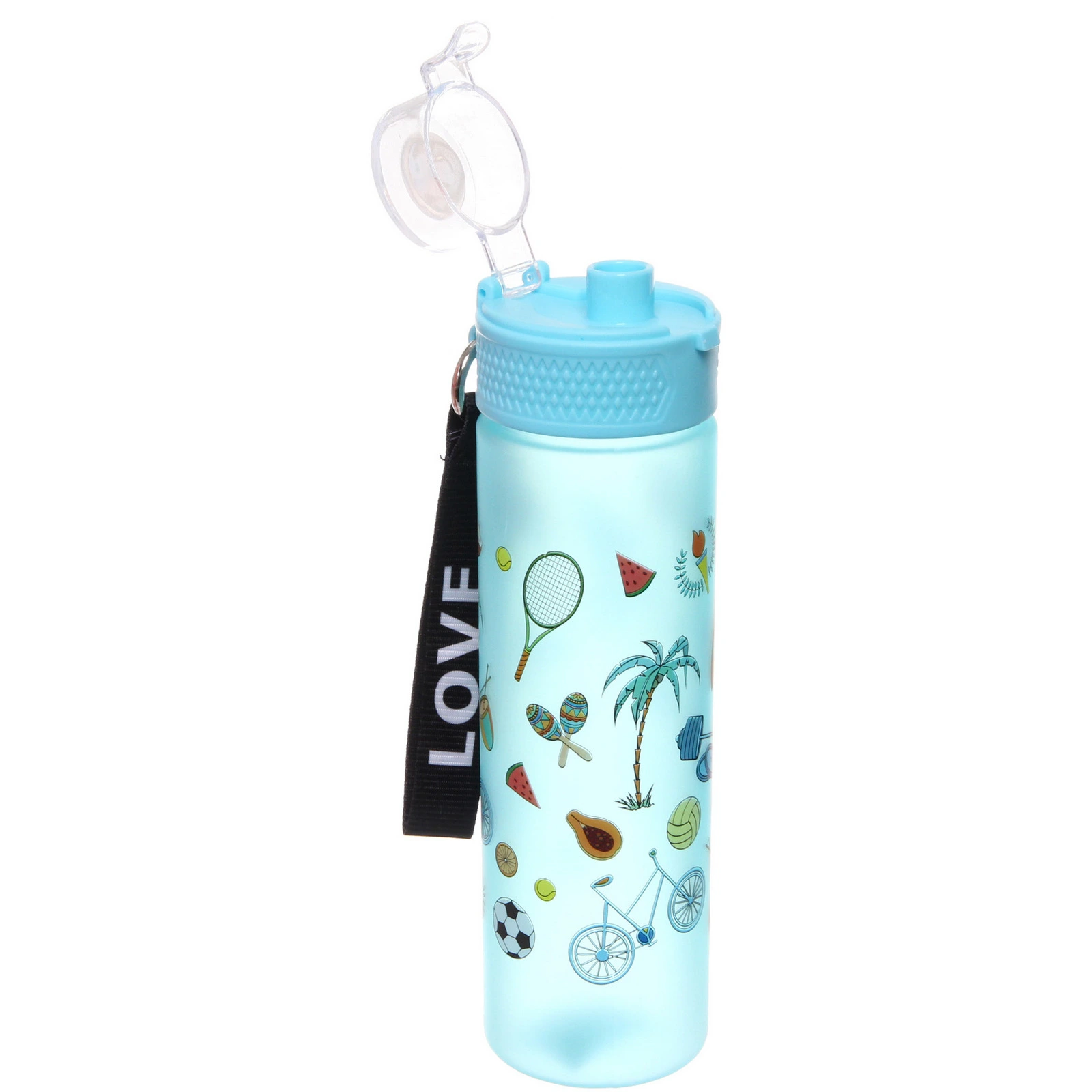 Бутылка украшена яркими принтами на тему спорта и летнего отдыха. Доступны разные цветовые решения и варианты рисунка. Товар представлен в формате «Разноцветный принт»: отгружается один экземпляр, расцветка определяется случайным образом из доступных.
