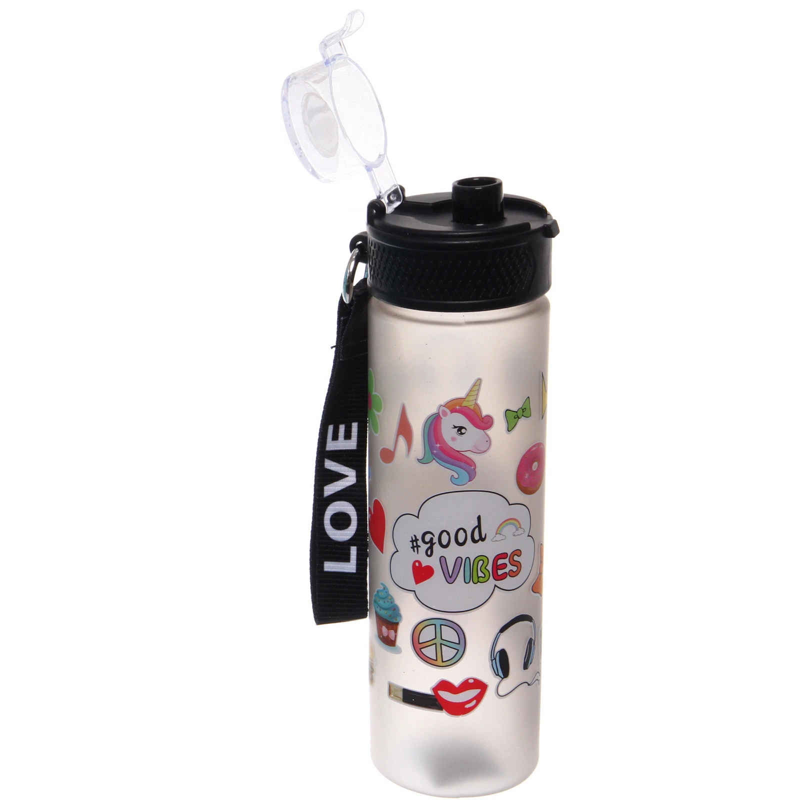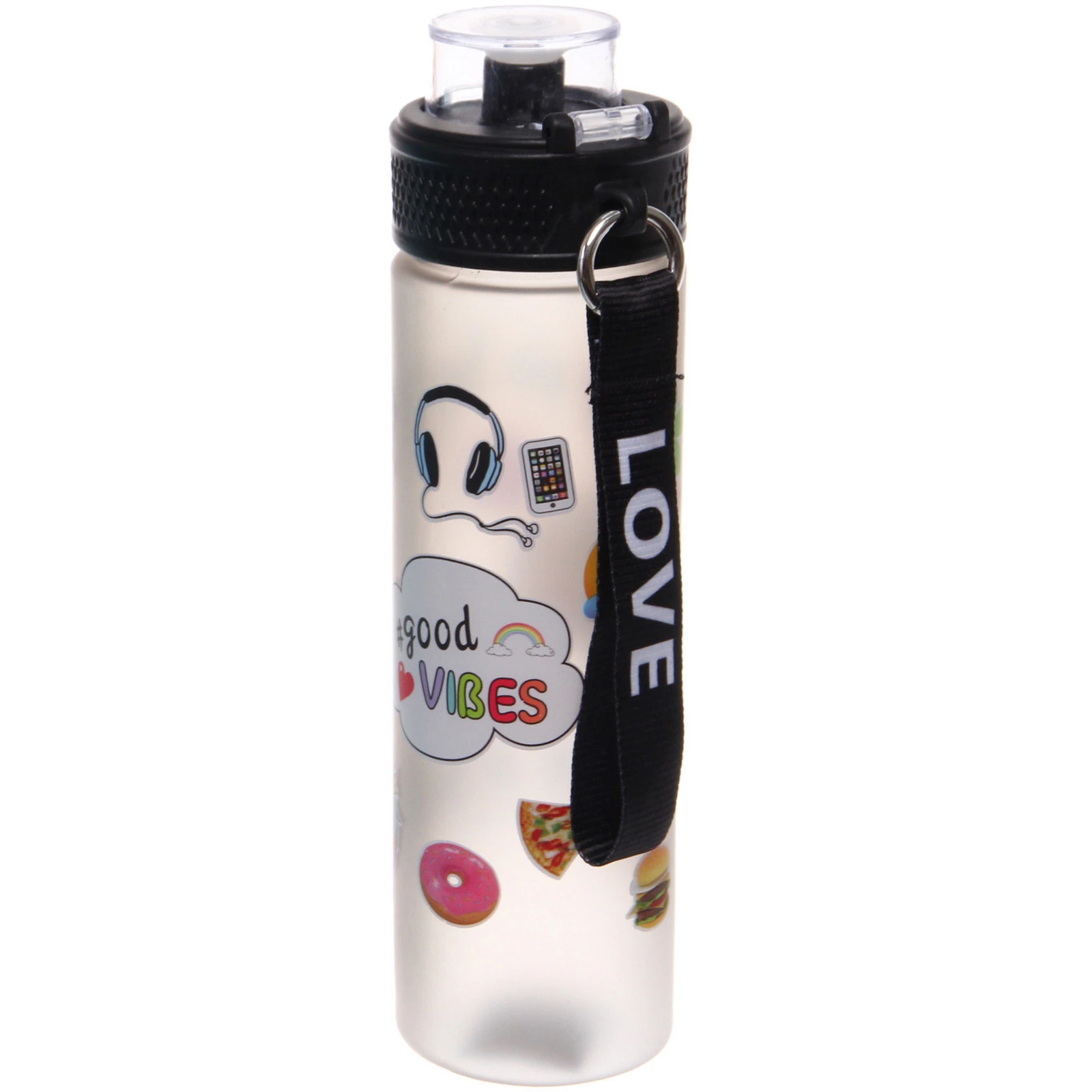 Модель выполнена из пластика с матовой полупрозрачной поверхностью. Рифленая крышка оснащена прозрачным откидным колпачком и защелкой, что позволяет быстро открыть бутылку и защитить питьевое отверстие от загрязнений. Тканевый ремешок облегчает переноску и добавляет удобства в повседневном использовании.