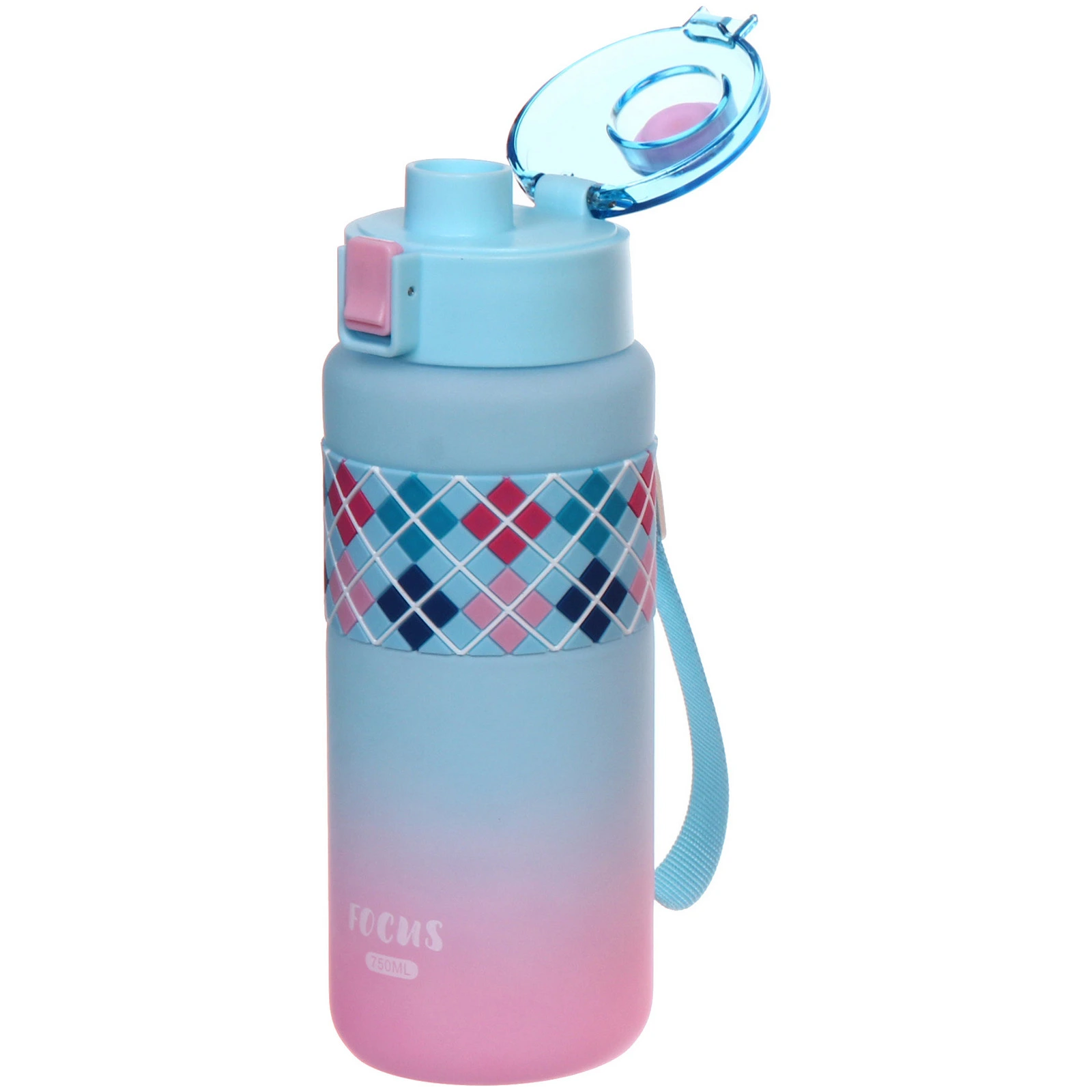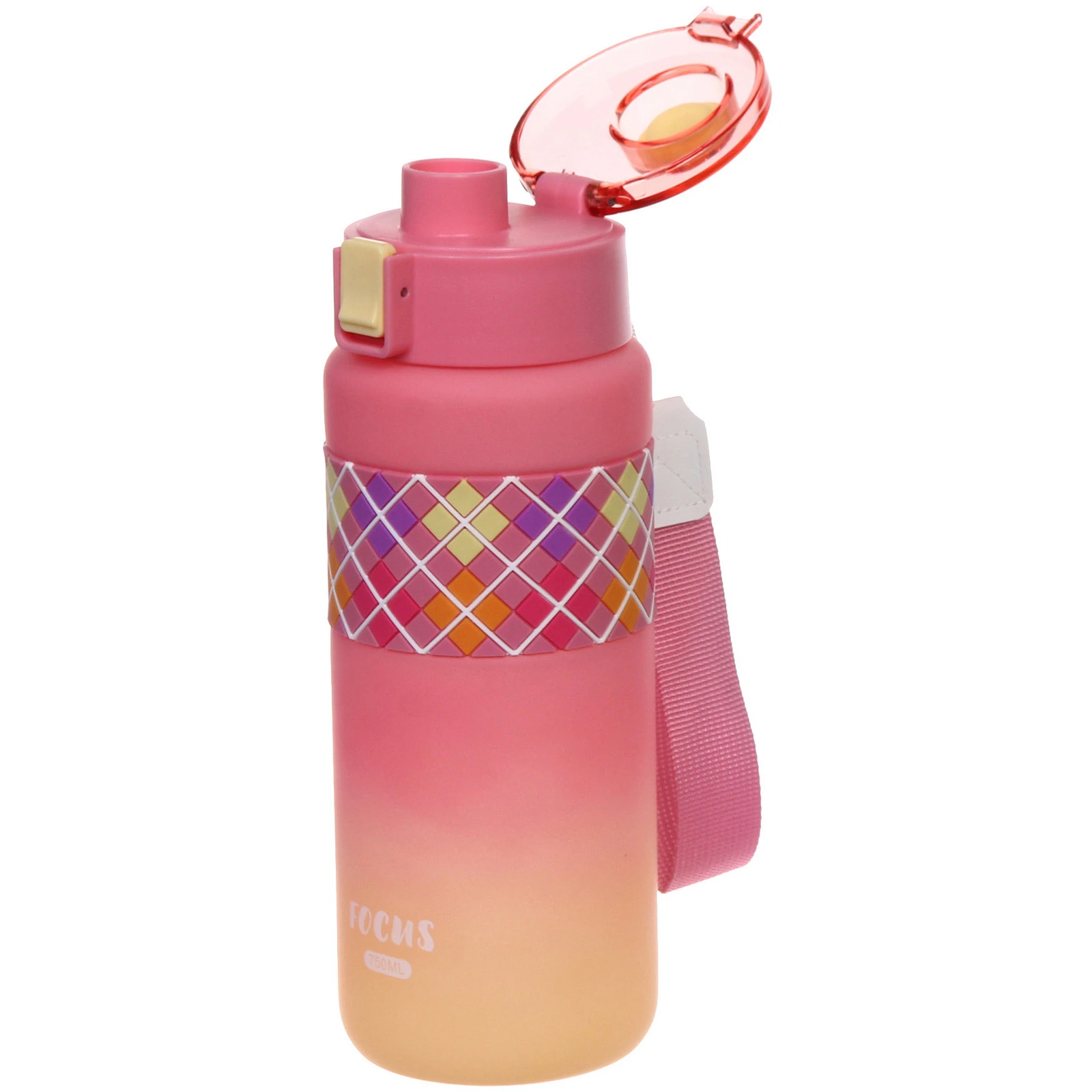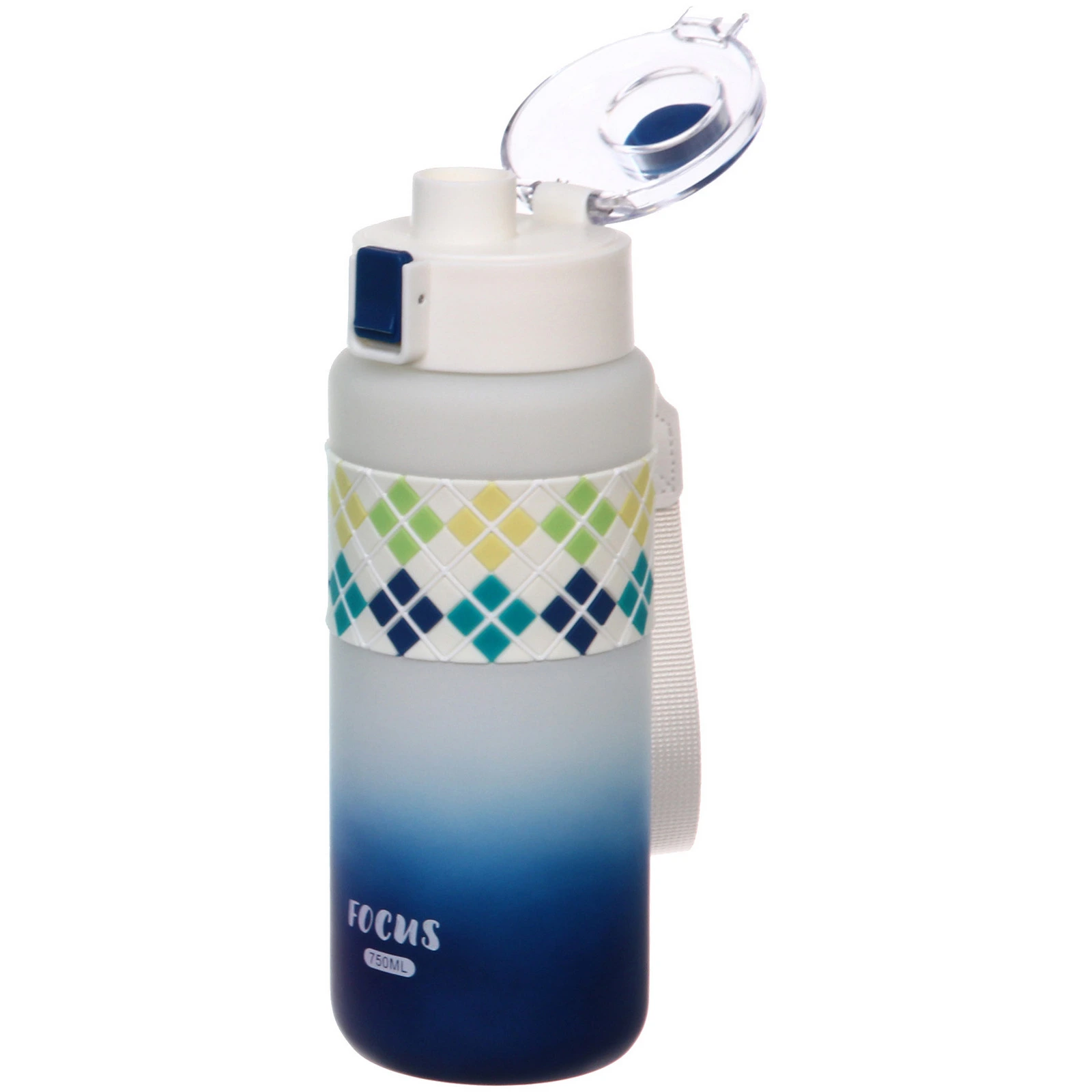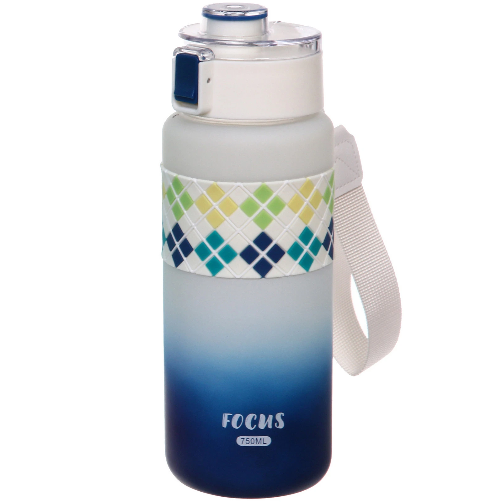 Корпус выполнен из пластика с матовой поверхностью, которая приятна на ощупь и менее скользит в руке. В центральной части расположена силиконовая вставка с рельефным узором — она обеспечивает более надежный хват. Объем 750 мл оптимален для активного дня без частых доливов.